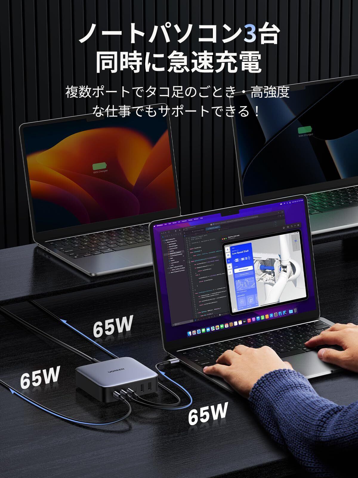 【全てのタイプC ポートはPD充電対応!6つのデバイスを同時に】進化されたGaN III世代技術を採用して、全てのタイプCポートはPD3.0急速充電に対応出来ます。小型化に成功しながら超高出力を実現して、三台のパソコンを同時に65Wのパワーで充電することを可能にします。スマホやタップレト、スイッチはもちろん、単ポート100Wまでの出力パワーにおいて、MacBook Pro 16インチを90分間で0%-100%充電出来て電源切れの心配はありません .