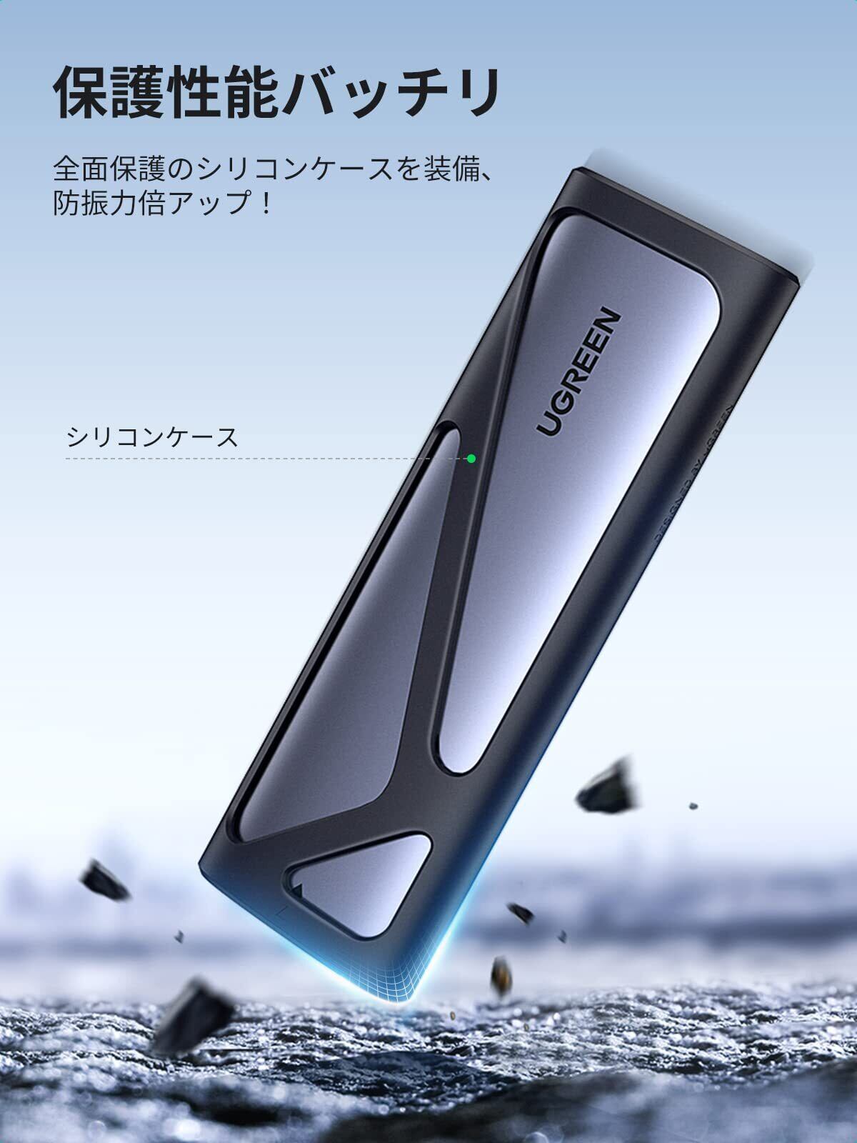 【SSD 外付けケースをバッチリ防御】UGREEN このM.2 SSD 外付けケースは緩衝材としてシリコンラバーを付属しているので、外部からの衝撃を大幅に消散。デスク上で滑ったりせずSSDをしっかり保護します。又は僅か119 x 37 x 12 mmのコンパクトサイズで、海外へ出張や自宅・職場・旅行など、様々な場所への携帯にも便利です。