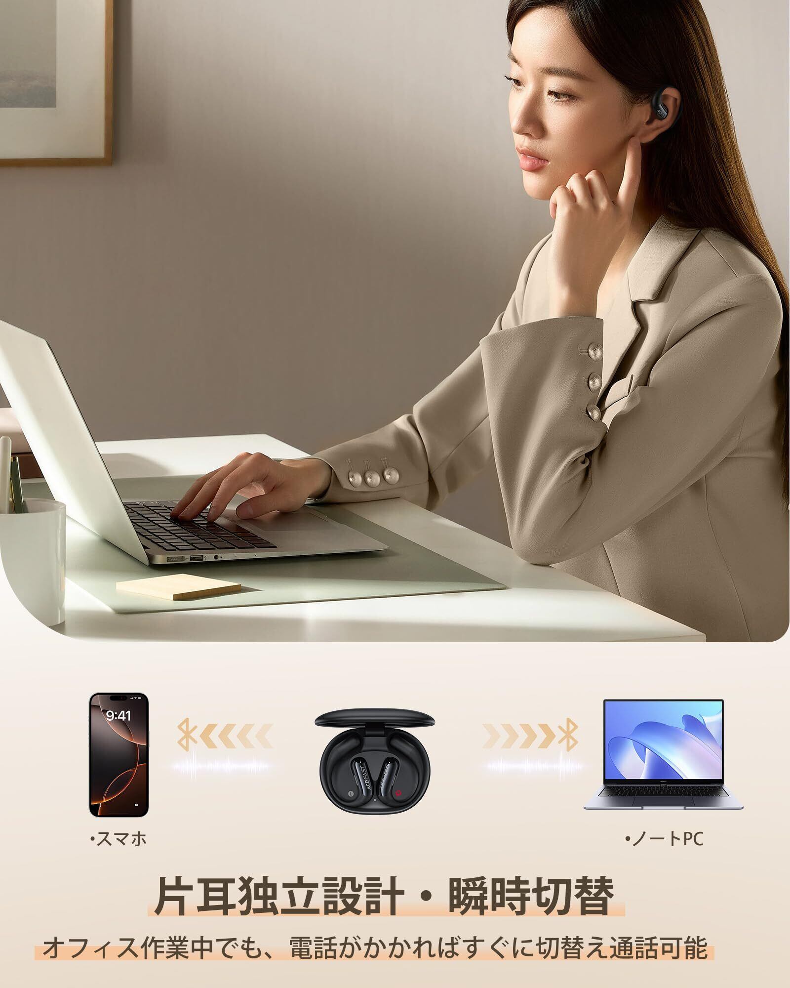 【静寂の中のクリアなENC通話体験】 ENCノイズキャンセリング技術で周囲の環境音をカットし、相手の声をクリアに、鮮明に届けるから、街中でも地下鉄でも、周囲の音を気にせずスムーズな会話が楽しめます。一度に2台のデバイスに接続可能な一拖二機能で、通話と音楽を瞬時に切り替えられる利便性も抜群。さらに、漏れ聞こえを防ぐ音響設計により、声が耳元にクリアに届き、プライバシーもしっかり確保。雑音に邪魔されない快適な会話をどんなシーンでも提供する、次世代の通話体験をお楽しみください!