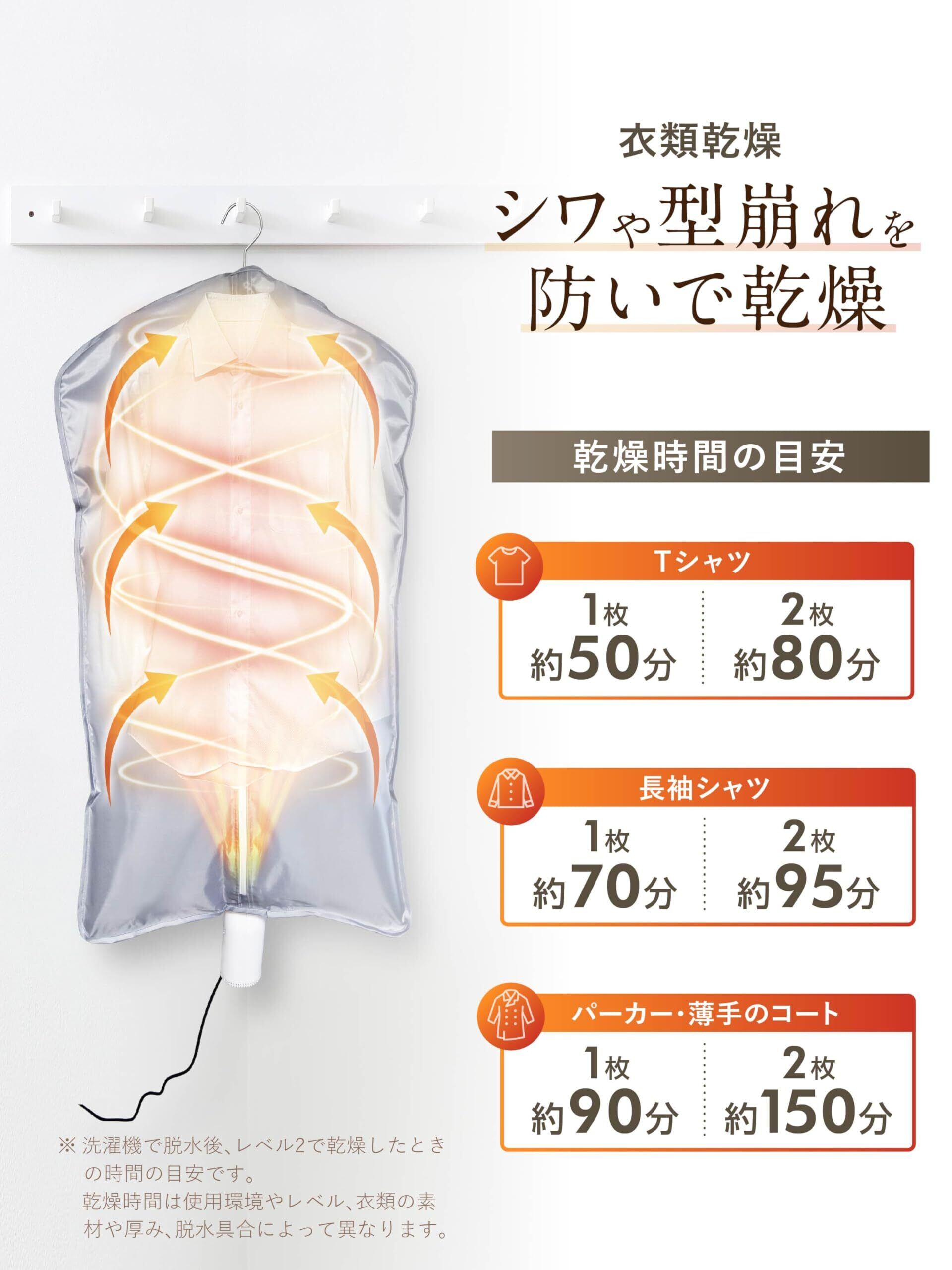 【セット内容&機能】セット内容:乾燥機本体、ホース、衣類乾燥袋、靴用ヘッド、取扱説明書兼書。二段階温風機能:LEVEL1:約50℃~約60℃。LEVEL2:約60℃~約70℃。安全性にこだわった機能:①三段階タイマー機能付きで安心。②吸気口を2か所設置。③過熱防止。