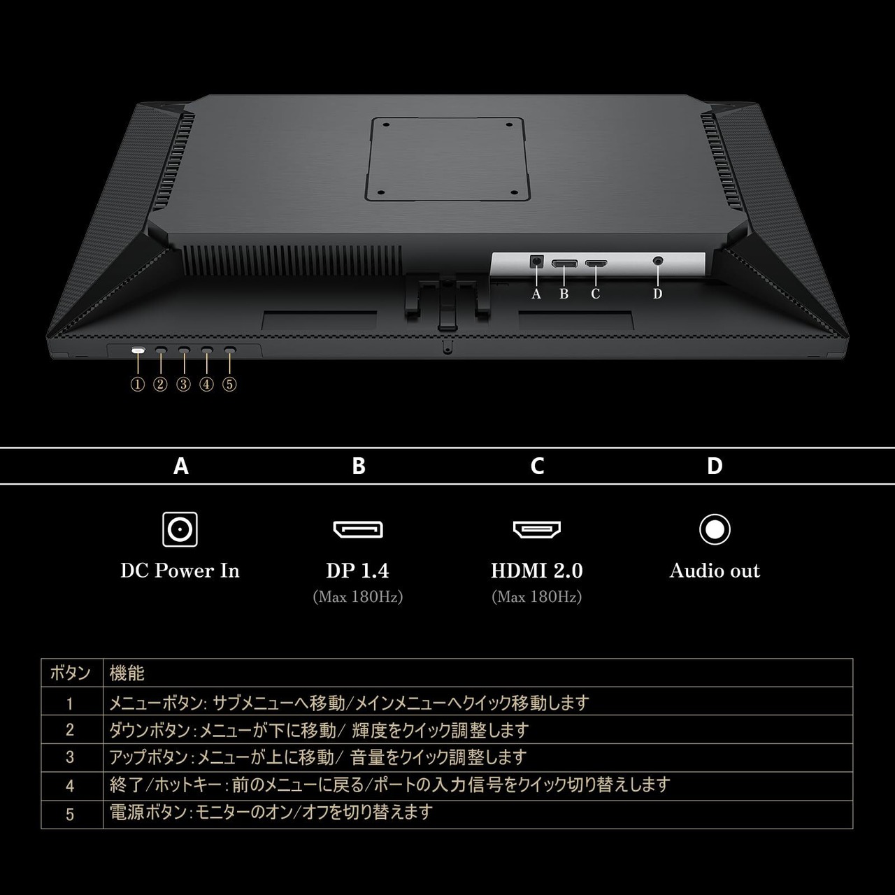 【多様な接続端子】最新の接続規格に対応!HDMI2.0(1980*1080@180Hz) とDP1.4(1980*1080@180Hz)で、180Hz ゲーミングモニターがスムーズな映像を体験可能。さらに、ヘッドホン端子も完備し、臨場感あふれるサウンドを楽しめます。