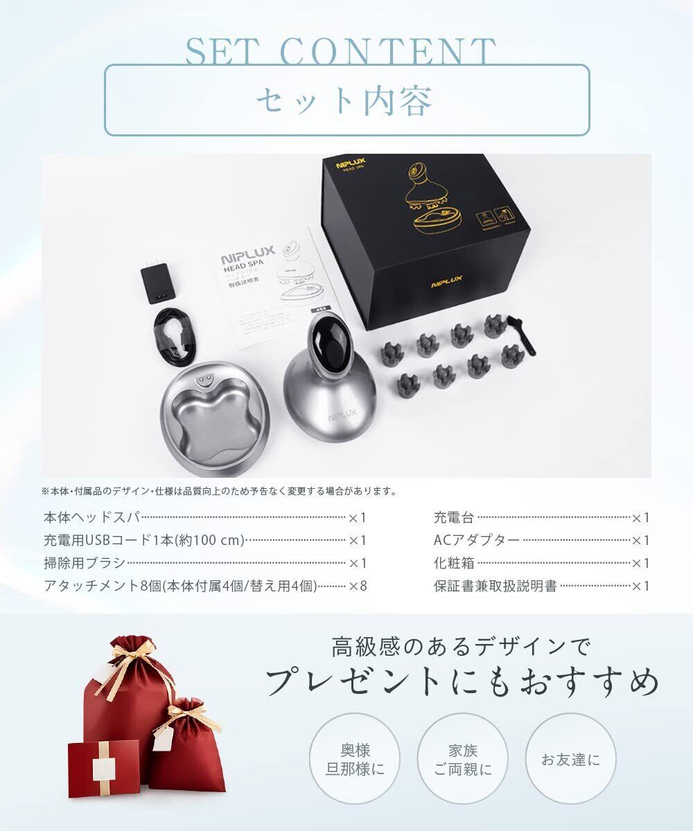 【美しさを追求】機能性のみならず、美しさにもこだわったNIPLUX HEAD SPA 。 滑らかで美しいフォルムと、光沢のあるシルバーの色味、しっくりと手になじむ持ち心地。パッケージも高級感のある素材を採用しており、母の日、父の日、敬老の日、誕生日、クリスマスや新年などのプレゼントにぴったりです。