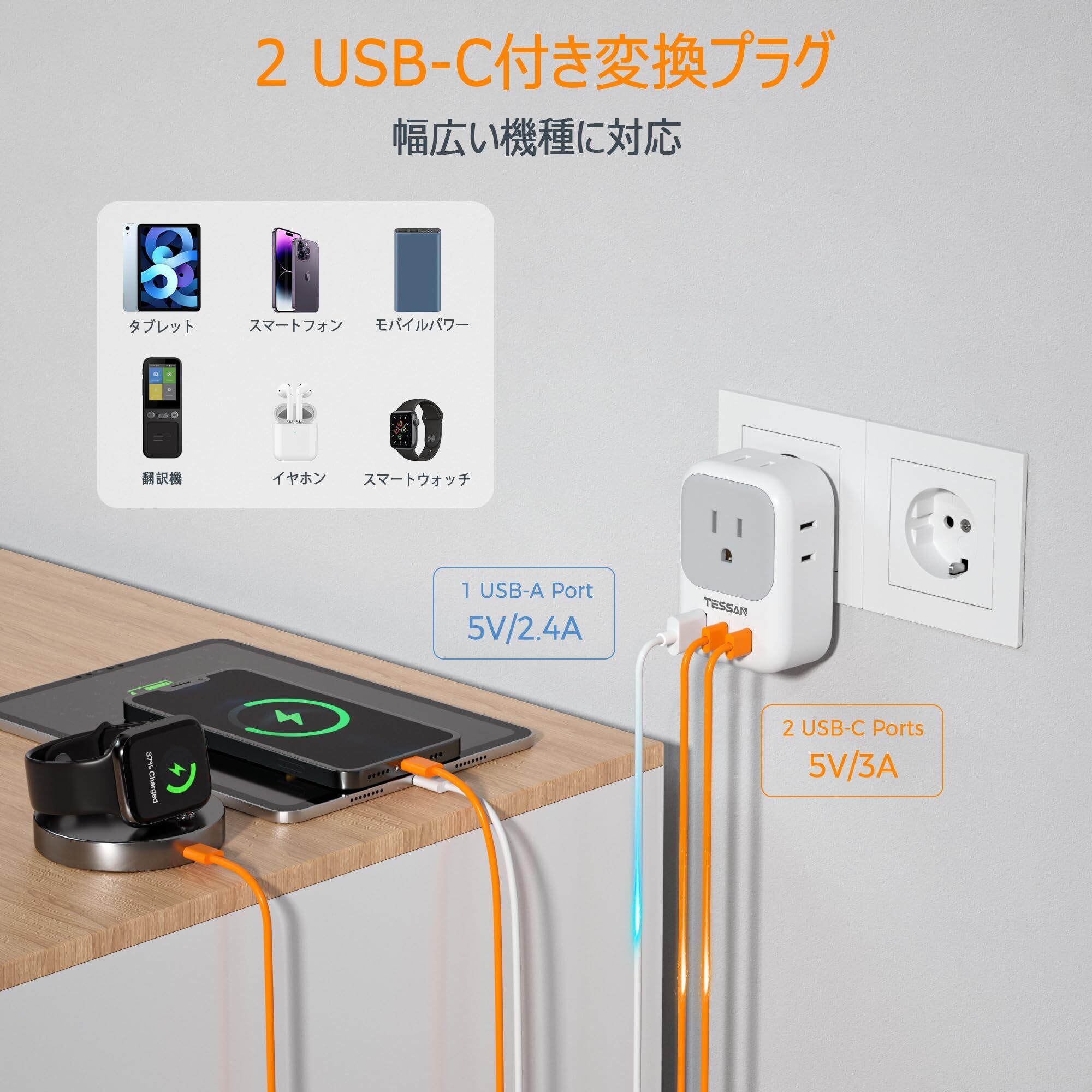 【出張・旅行 便利グッズ 2種類USB付き】このコンセント変換プラグは、2つのUSB-Cポートと1つのUSB-Aポートが搭載されています。従来のものと比べて、USB-Cの数が増え、より多くのデバイスを高速充電することができます。USB-Cの出力は最大15Wで、USB-Aの出力は12Wです。