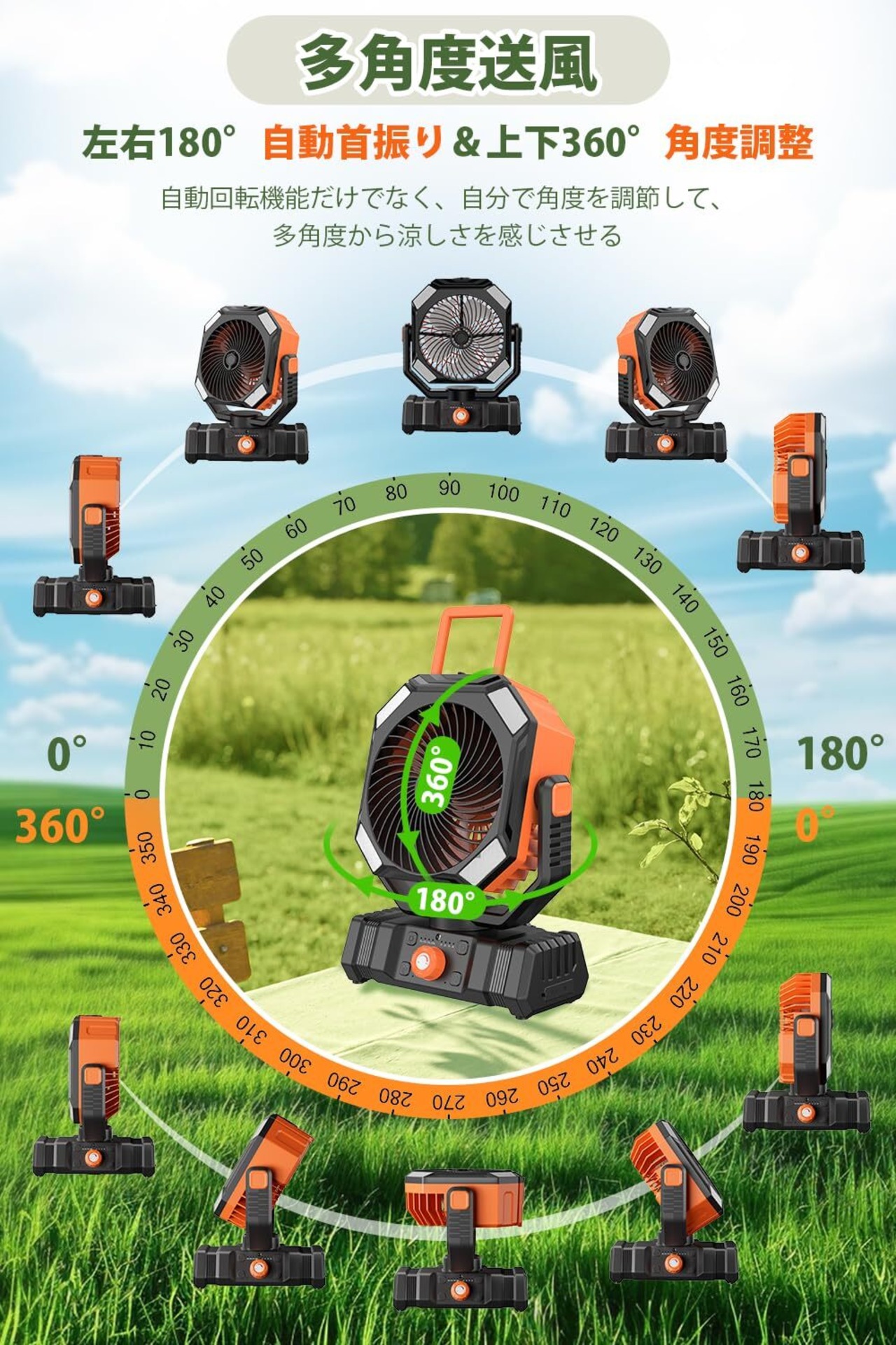 【無段階の次世代操作・180°自動首振り機能・360°角度調整機能搭載!】JUUMIIYのキャンプファンは0~100%無段階調節可能で、微風から強風まで1%単位で精密調整可能。使用時はお好みに合わせて自由に風量を調節できます。180°自動首振り(高速/低速2つモード)と360°手動上下調節角度でテント全体に快適な風を届けます。直感的な回転ノブ操作で、専門店並みの微調整が簡単に!【自然の強風を再現する5枚羽根設計】5枚羽根が森のそよ風のような心地良い風を生成。人工的な硬い風とは異なり、まるで森の中にいるようなリフレッシュ感を実現。夏の暑さを忘れさせる極上のクールダウン体験を提供します。