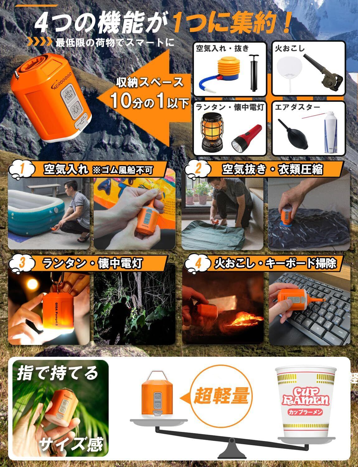 ✨【いつものキャンプ道具がこれ一つ】✨- 収納スペース10分の1以下。空気入れ・空気抜き・ランタン、火起こしや衣類整理、キーボード掃除が可能。荷物を最低限に抑え収納スペースを大幅に節約できるので、旅行やアウトドアに最適です。必要なものをコンパクトにまとめることができ、その分、他の荷物を載せることができます。多機能ながら、手のひらサイズでたったの100g!ワンボタン操作で、アウトドアや室内で幅広く活躍します。
