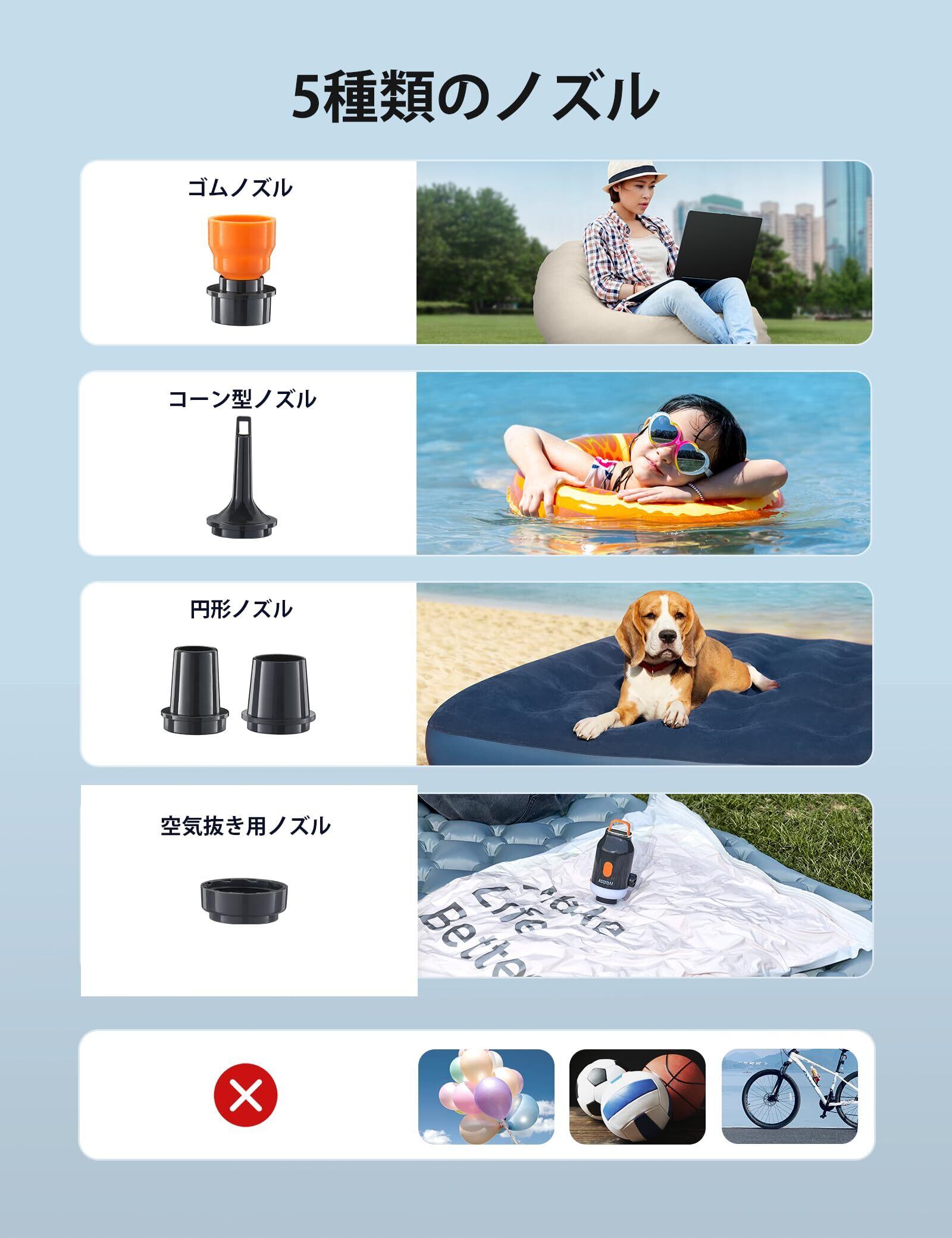 【5本のノズル・万能な用途】様々なものの空気入れに5種類のノズルがあります(ゴムノズル、コーン型ノズル、円形ノズルx 2本、空気抜き用ノズル)。 浮き輪、ゴムボート、エアベット、ビニールブール、圧縮袋などに適用です。また、保管袋が同梱されているため、アクセサリを簡単に管理して保管できます。