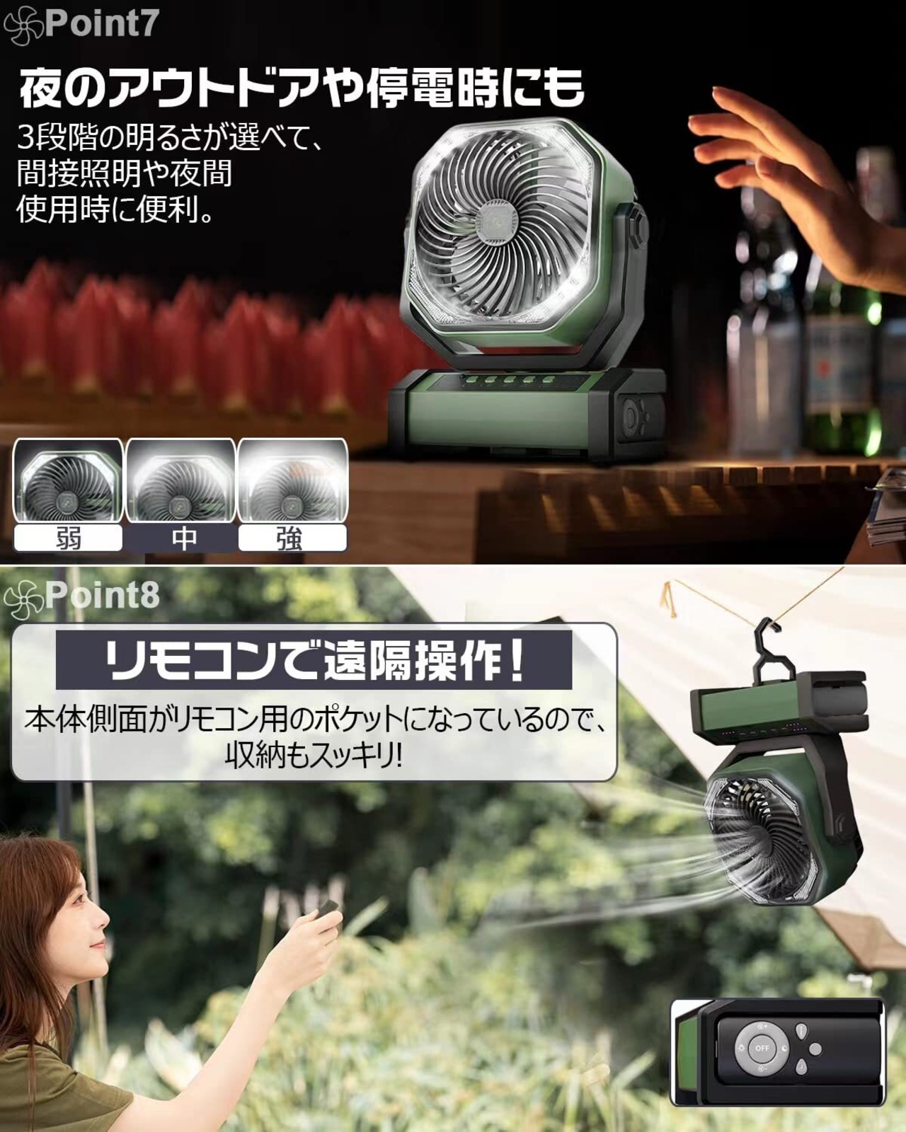 ❉【便利なリモコン操作&2WAY設置】離れた場所から操作が可能なリモコンも付属しています!本体側面に収納すれば、紛失防止もできます。AMZHOOZのキャンプ扇風機は“置く”と“吊るす”の2つの設置ができます。地面やラックの上に置いて、本体底部にあるフックでテントに吊るして、涼みながら照明として使えます。2つの設置方法で、どこでも涼しく快適に。
