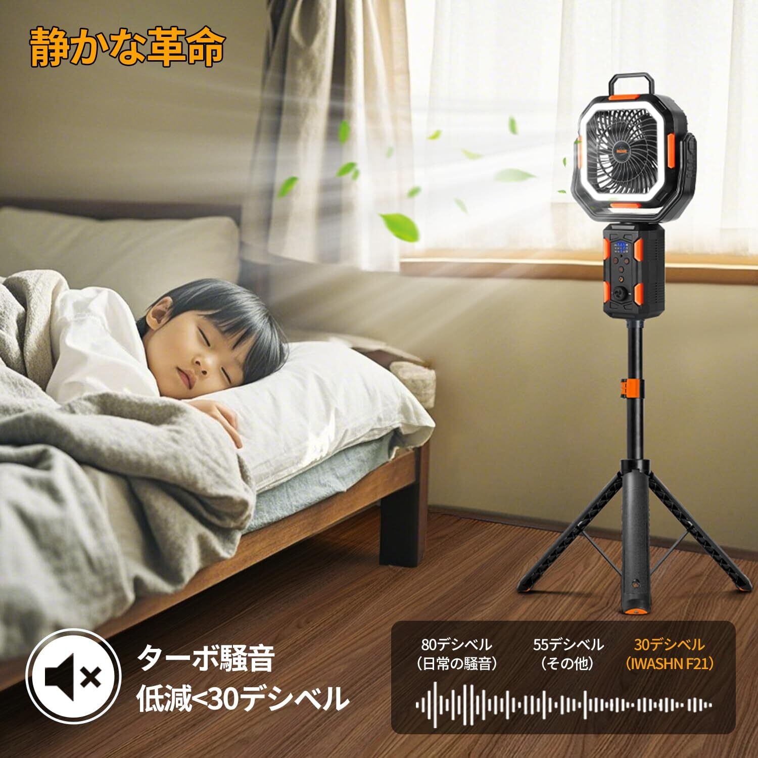 【超広角&長距離送風と照明機能】自動で左右に最大120度の4段階スイング機能と、最大270度の上下垂直反転調節機能を備えており、全方位に送風が可能です。8角形の32個の高品質LEDライトがあり、3段階で調節でき、快適な照明を提供します。最大20000mAhのバッテリーを搭載しており、最大12mの送風距離と最大38時間の長時間稼働が可能です。