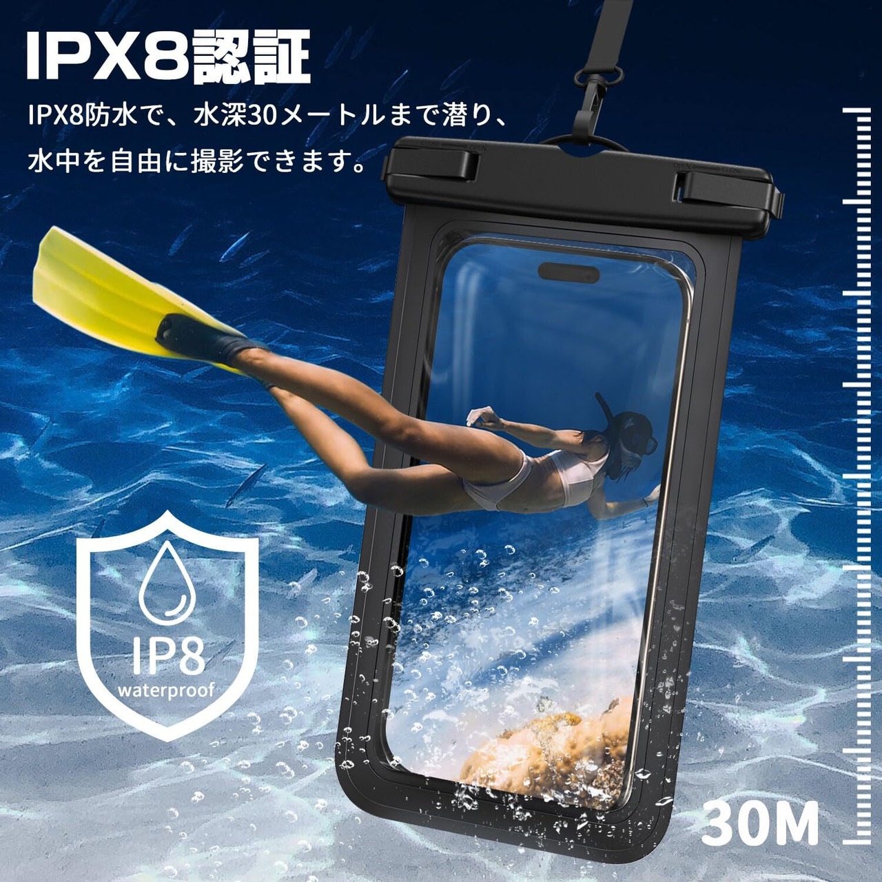 【IPX8認証】 スマホ 防水ケースはIPX8防水で、水深30メートルまで潜り、水中を自由に撮影できます。