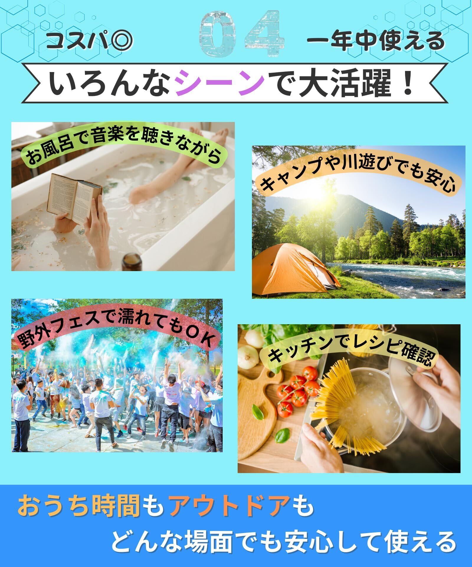 【使用シーンについて】「アクアグリンテシリーズ」の防水スマホケースは、日常からアドベンチャーまで幅広いシーンでの使用を想定して設計されています。海水浴やプール、川遊び、サーフィン、ダイビングなどのマリンスポーツ、お風呂やキッチンでのレシピ確認時の水しぶきにも対応。さらに、アウトドアや野外ライブ、フェス、テーマパーク、スノーボードなど、あらゆるシーンでスマホを全方位から保護します。防水スマホケースとして、コスパも高く、小物も一緒に収納できる便利な防水ポーチです。