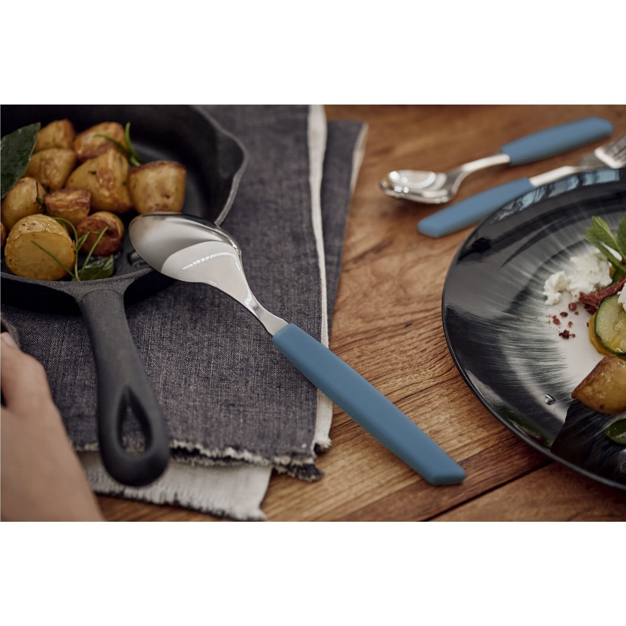 毎日の食卓を彩るスイスモダンシリーズのテーブルセット。硬い食材や柔らかい食材の両方を簡単にカットするのに最適な波刃のナイフと、新たにデザインされた大小のスプーンとフォークがセットに。軽量で食洗機にも対応しており、ハンドルは人間工学に基づいたエレガントなデザイン。キッチンやダイニングテーブルを明るくするカラーリングのテーブルセットです。