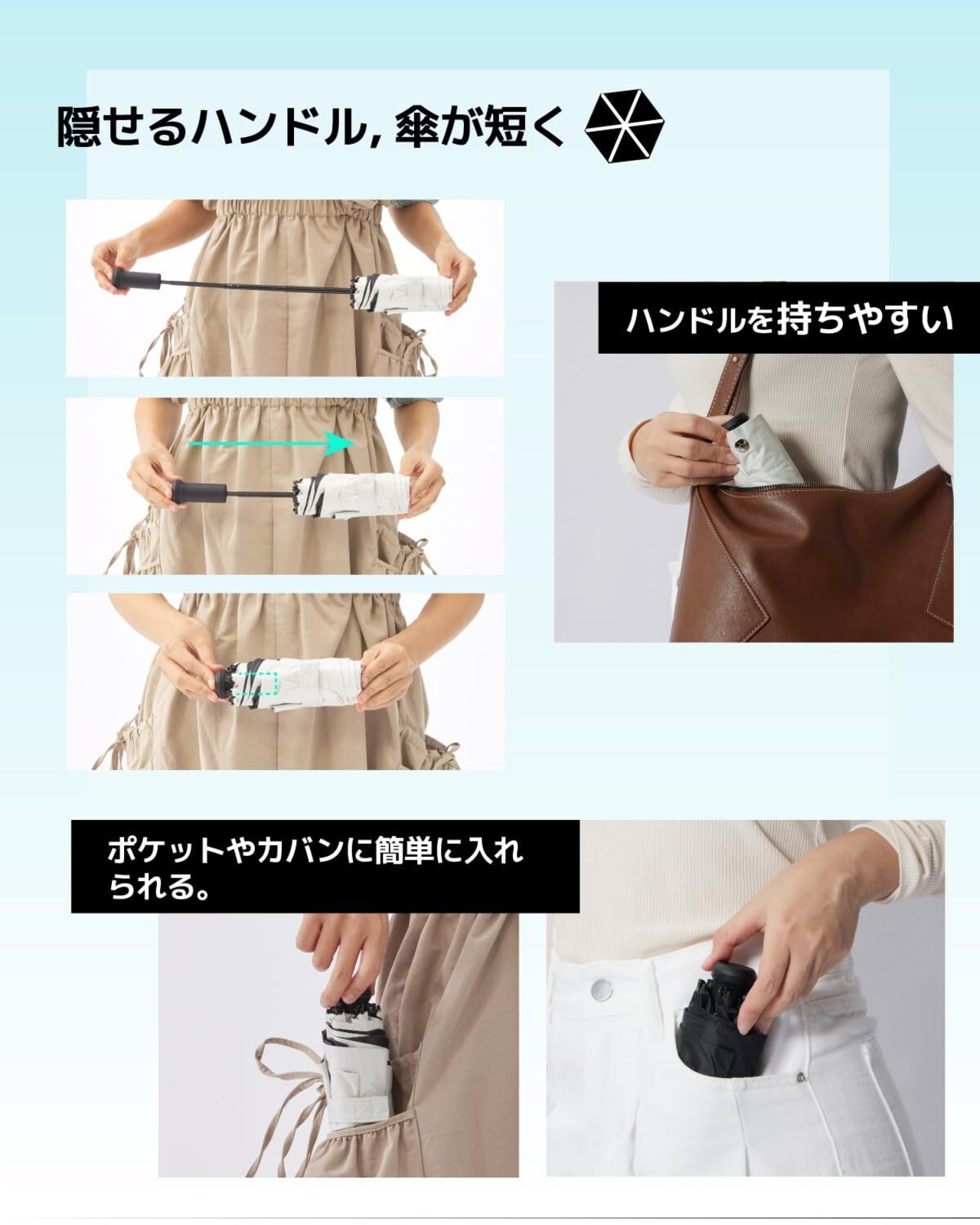 【持ちやすい傘の柄】マジックのような隠せるハンドルは収納した長さを短縮,ハンドル長さ(7cm)使い心地がよい!