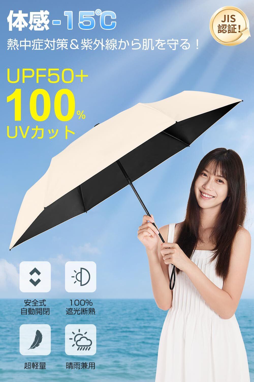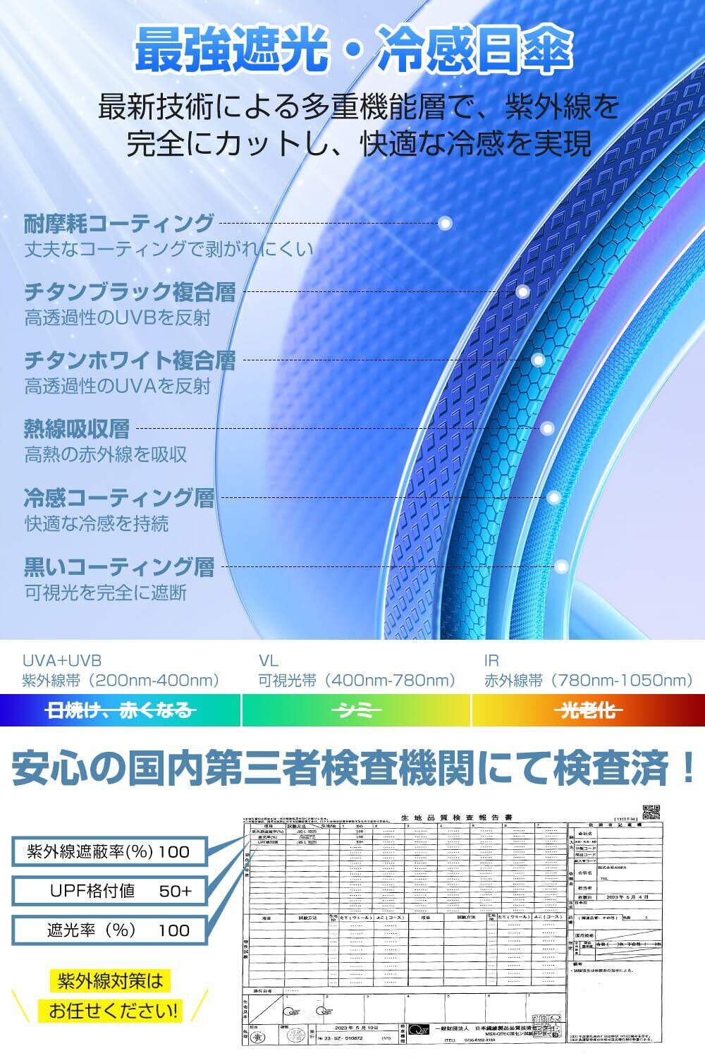 【JIS認証・UVカット率100% & 完全遮光】日本の厳格な国家規格認証を取得し、UVカット率100%、遮光率100%を実現した高品質な日傘です。多層遮断生地を使用し、紫外線A波(肌の深層まで届く)、B波(肌を赤くする)、C波を100%カット、UPF50+の紫外線防止指数で強い日差しから肌を守ります。また、優れた遮熱性を備え、暑い夏の熱中症対策にも最適。開傘すると、涼しい木陰のような快適さを提供します。