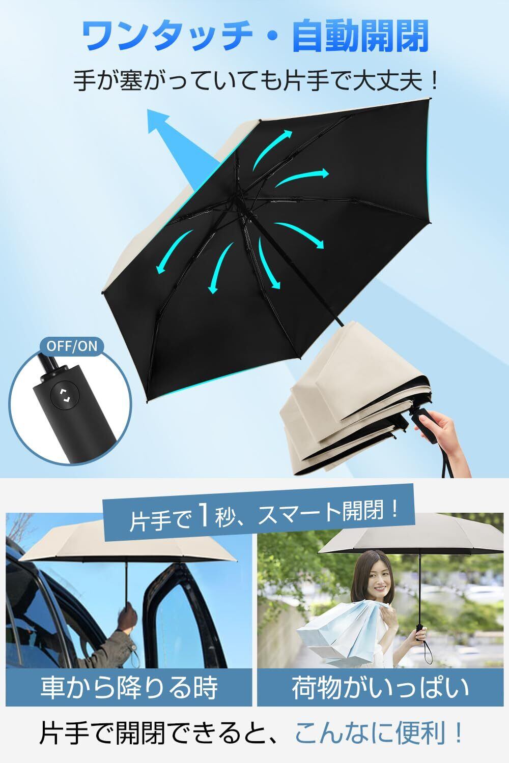 【業界初!跳ね返り防止安全式段階収納 & 自動開閉】傘を閉じるのが難しい、または不注意で跳ね返ることはありませんか?新世代のBEMOKURI自動開閉折りたたみ日傘は、これらの悩みを解消します。独自の安全式段階収納設計で、跳ね返りを防ぎつつ段階的に簡単に収納でき、省力化60%!小学1年生でも簡単に使えます。さらに、ワンタッチ自動開閉機能を搭載し、手が塞がっている時でも片手で簡単に開閉できます。