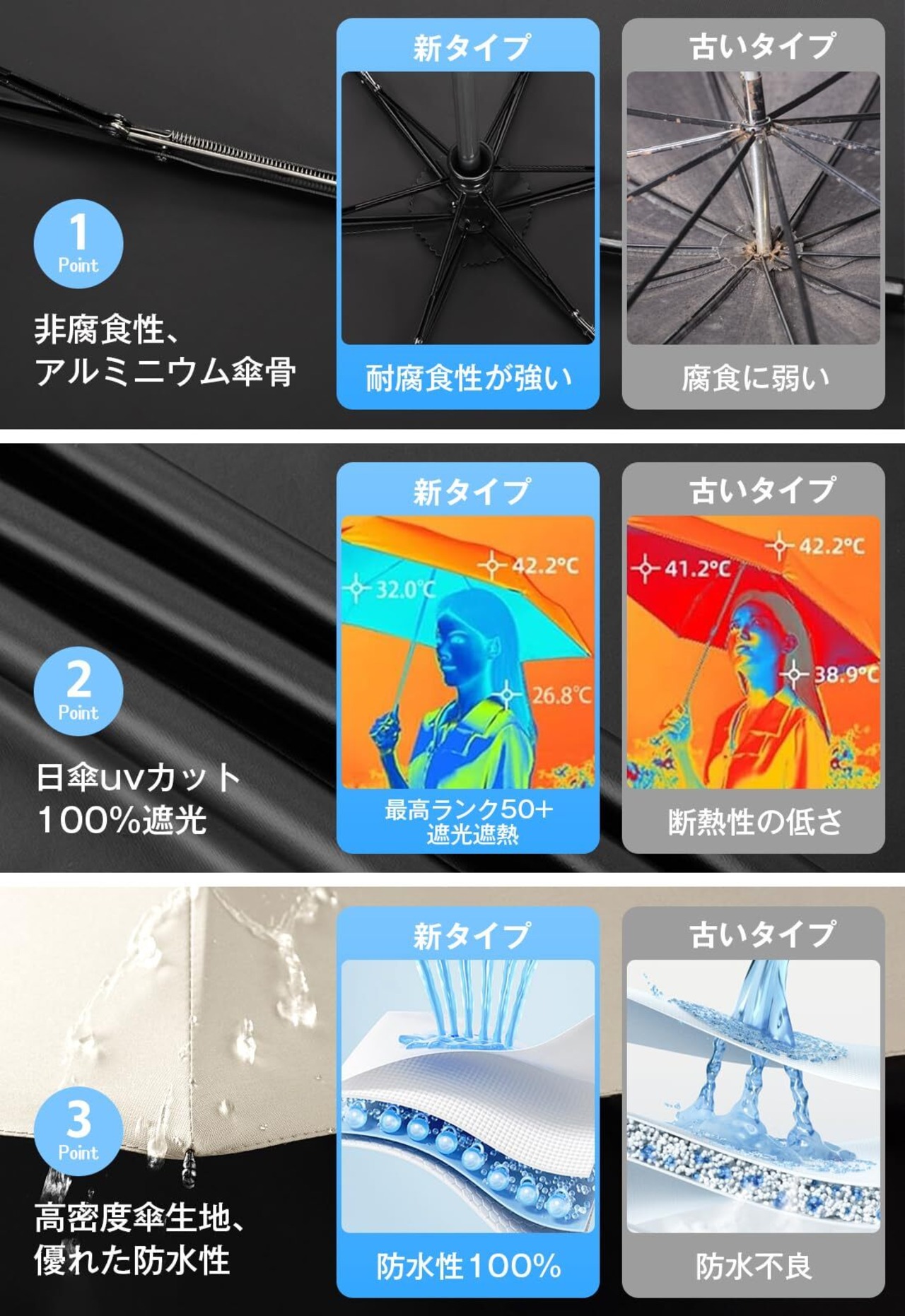 【折りたたみパラソルの利点】日傘は直射日光を遮り、肌を紫外線から効果的に守ります。これにより、日焼けや紫外線による肌の老化を防ぐことができます。暑い夏の日には、日除け傘が涼しい空間を提供し、暑さから身体を守り、表面温度を効果的に下げることができます。また、日焼け防止機能に加えて、多くの日傘は雨の際にも保護を提供し、身体を濡らさずに済みます。