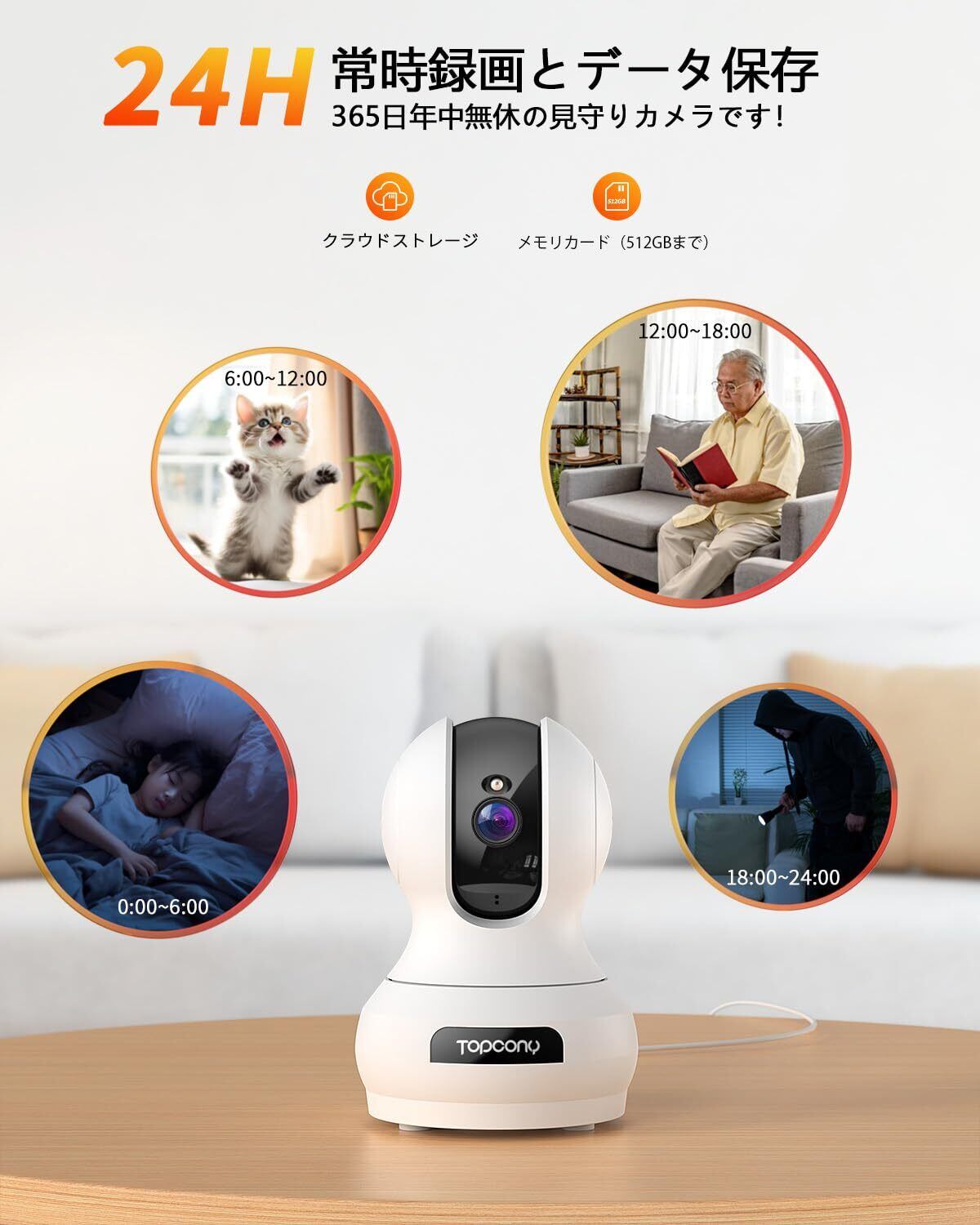 【24時間録画・自動上書き・カード/クラウドストレー対応・ネット切断記憶機能】この屋内用カメラは、最大512GBのカード(別売り)と自動上書き機能に対応して、古いファイルに自動的に上書きしながら録画をするので、メモリ不足を心配する必要はありませんです。24時間常時録画・365日年中無休の見守りカメラです。常時録画だけでなく、モーション/サウンド/人体の検知録画の設定も可能で、モーション/サウンド/人体を検知すると自動に録画開始します。また、クラウドストレー(有料)に対応して、データのバックアップに使えて、データ管理はとてもやすいです。さらに、ネット切断記憶機能を搭載して、ネットワークが一時的に途切れてもこの間のデーターを保存できて録画が続けます。ネット不安定な場合でも重要な情報を逃さないです。(予め24時間録画をオンにして、カード使用する必要
