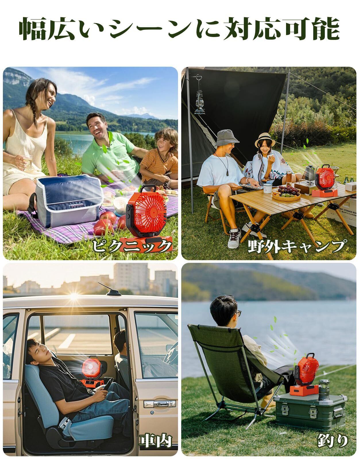 【3段階の調光モード&タイマー機能】アウトドア用扇風機はLEDライト搭載し、明るさは三段階で、様々なシーンにお好みに合わせて調整できる。低輝度モードは柔らかく、まぶしい光ではなく、読書や常夜灯として最適。高輝度モードはテント内を照らすことができ、キャンプ、ハイキング、その他の夜間のアウトドアアクティビティにも最適。停電などの非常時にも便利です。ボタン長押しで夕焼け色や晴天光や自然光などの色温度を自由に選択できます。この多機能扇風機にはタイマー機能が付いています。自動スイッチオフ時間を1H/2H/4H/8Hに設定できるため、夜間に寒すぎて眠ってしまったり、スイッチを切り忘れたりするのを防ぐことができます。