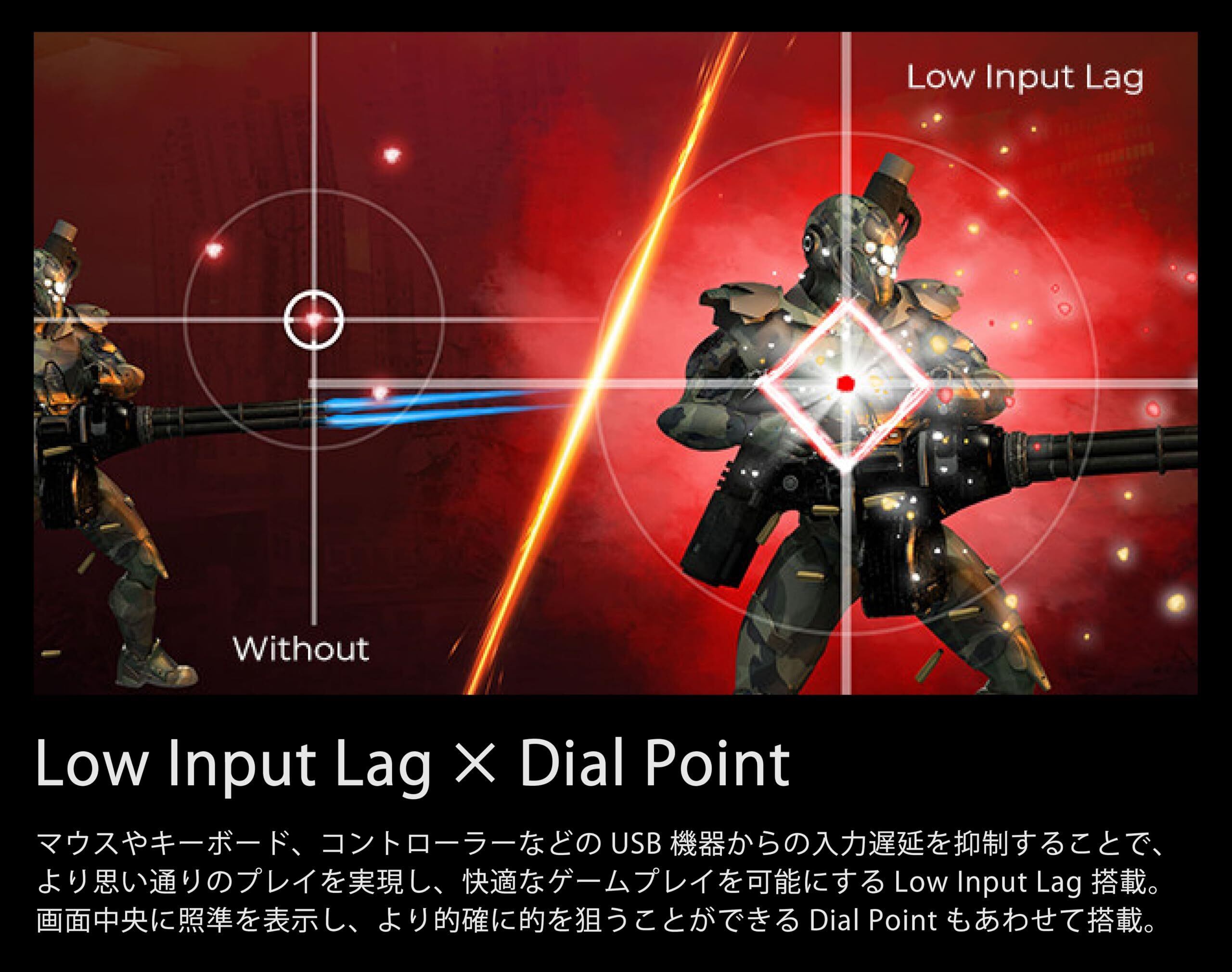 【ゲームカラー】 輝度や色階調をゲームに合わせてできめ細かく調整が可能、ゲームに合わせて最適な調整にすることができる機能です。【Dial Point】 画面中央に照準を表示し、より的確に的を狙うことができる新機能。FPSユー ザーには心強い機能です。【USB機器の入力速度向上機能「Low Input Lag」 (表示遅延読み込み機能)】 マウスやキーボード、アーケードコントローラーなどのUSB機器からの入力遅延を抑制することで、より思い通りのプレイ を実現し、快適なゲームプレイを可能にする機能です。【AOCについて】 リフレッシュレート144hz以上ゲーミングモニター世界において、2021~2023年連続TOPシェアを記録。多くのゲーマーに選ばれたトップクラスのゲーミングブランドです。