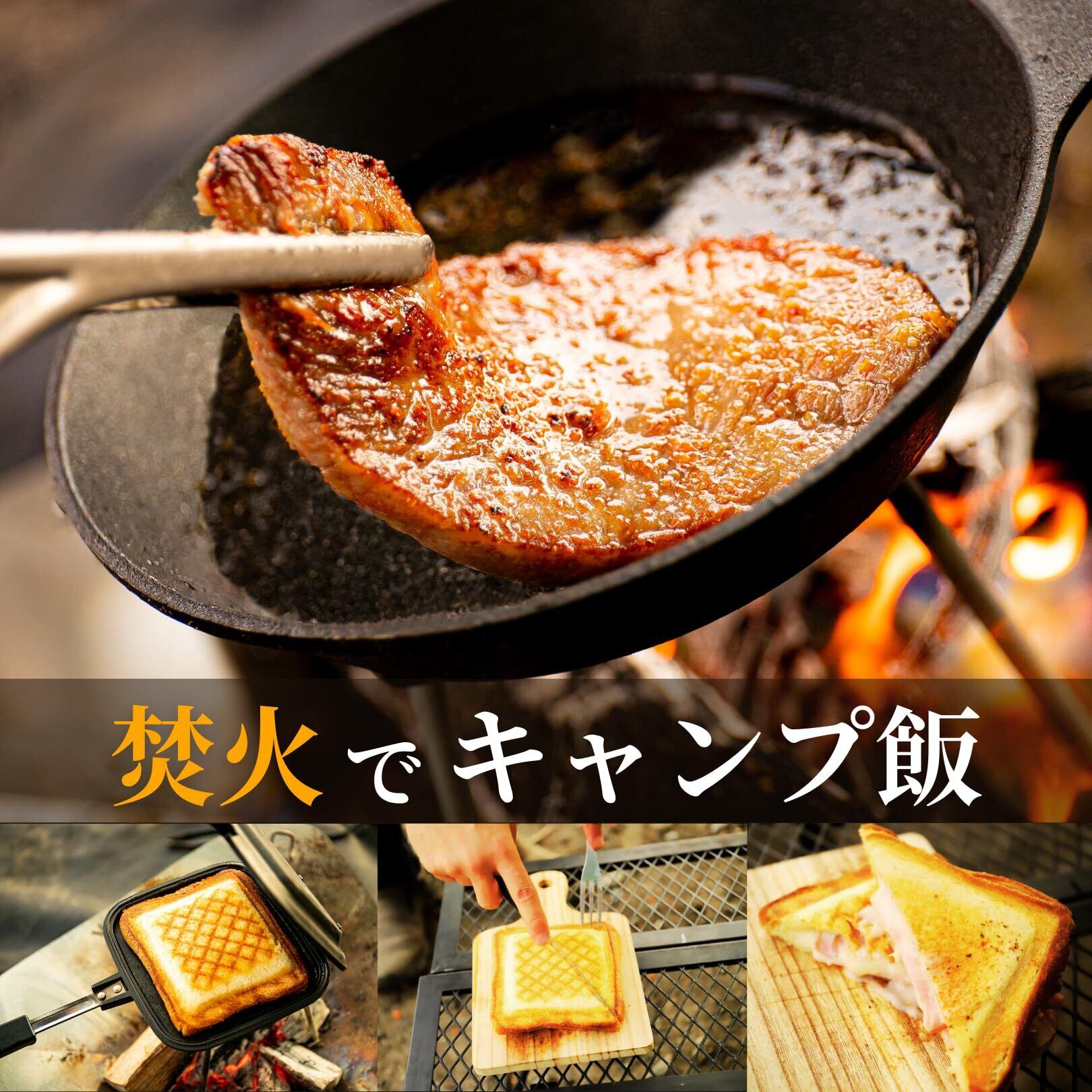 【様々なクッカーに対応】スキレット、ケトル、メスティン、ホットサンドメーカーなど様々なクッカーを五徳に乗せて調理できます。焚火の直火を使った本格的な調理を楽しめ、キャンプの楽しみが広がります。