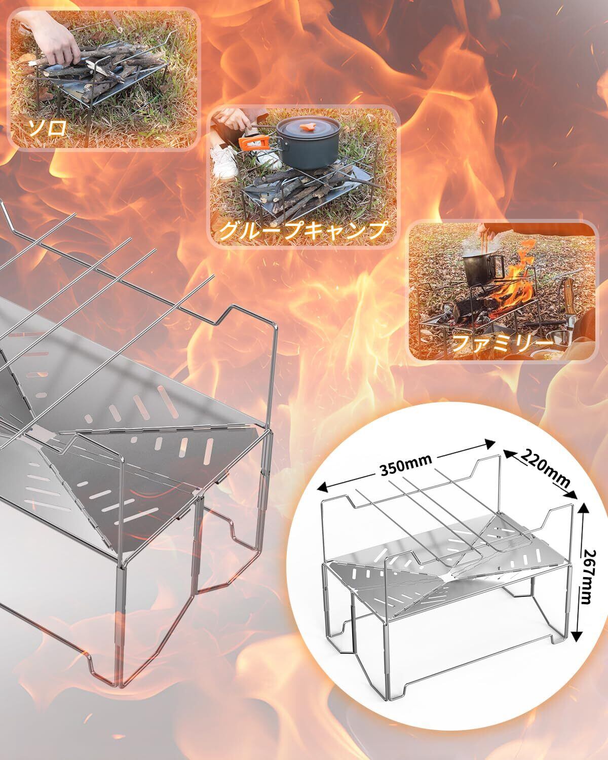 【高い燃焼効率】 底部には専用の通気孔が備わり、優れた通気性を確保し、燃焼効率を向上させ、より良い焚き火体験をもたらします。この折り畳み式焚き台はステンレス製で、全身水洗可能なため、錆など心配はありません。