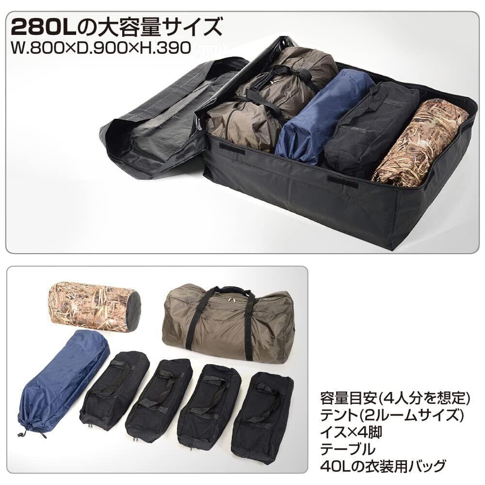 ●容量280L、容量目安:テント(2ルームサイズ)・イス×4脚・テーブル・衣類用バッグ(40L)