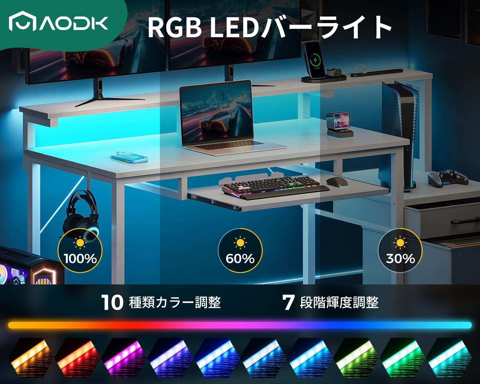 【RGBバーライト付き、お部屋の雰囲気が変わる】ゲーム机には10段階調色・9段階調光のLEDバーライトを搭載しており、気分やシーンに合わせてカラーを切り替えることができる。より頑丈で長持ちやすい。臨場感にあふれるゲーム雰囲気だけではなく、温かみのある学習・仕事環境も作り出せる。