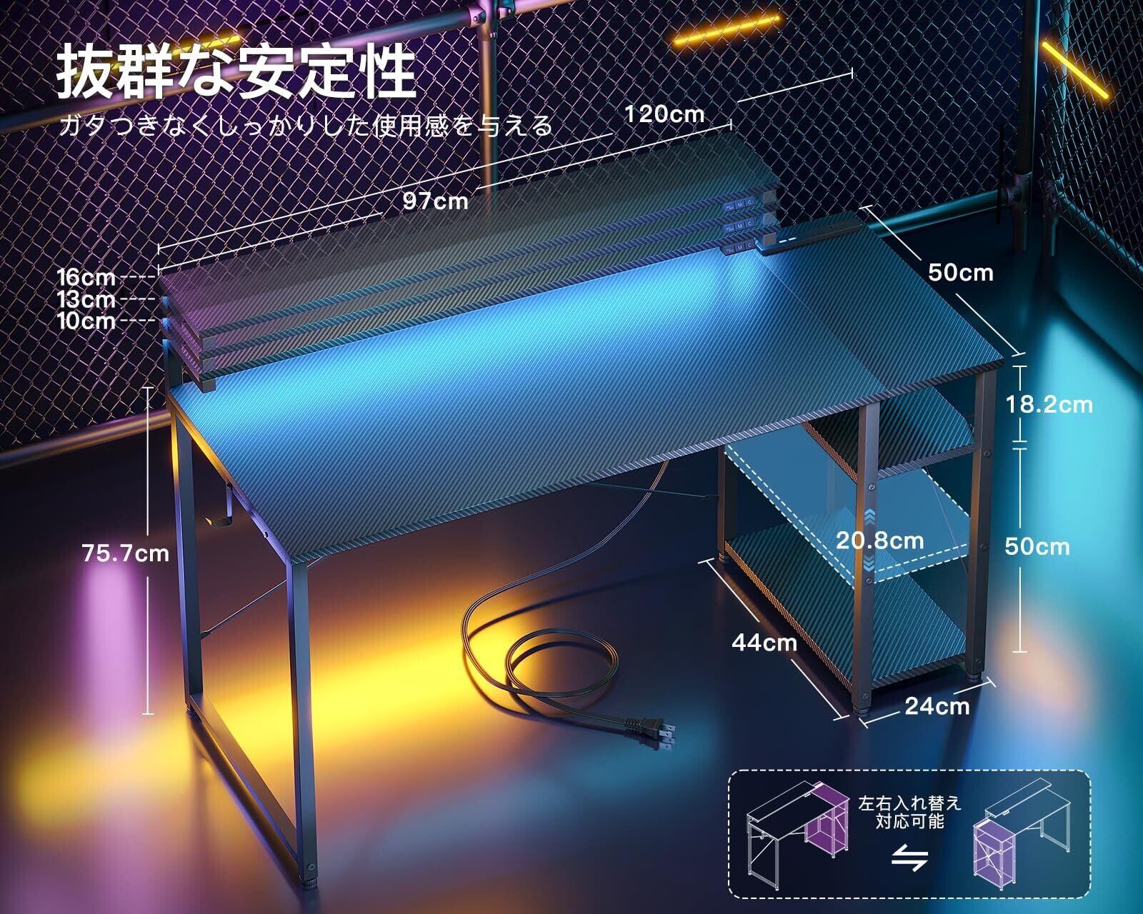 AODK ゲーミングデスク パソコンデスク ラック&コンセント付き 幅120cm 机 pcデスク ゲームデスク gaming desk モニター台&LED付き ゲーミングテーブル 左右入れ替え対応 カーボン調ブラック | Lulu