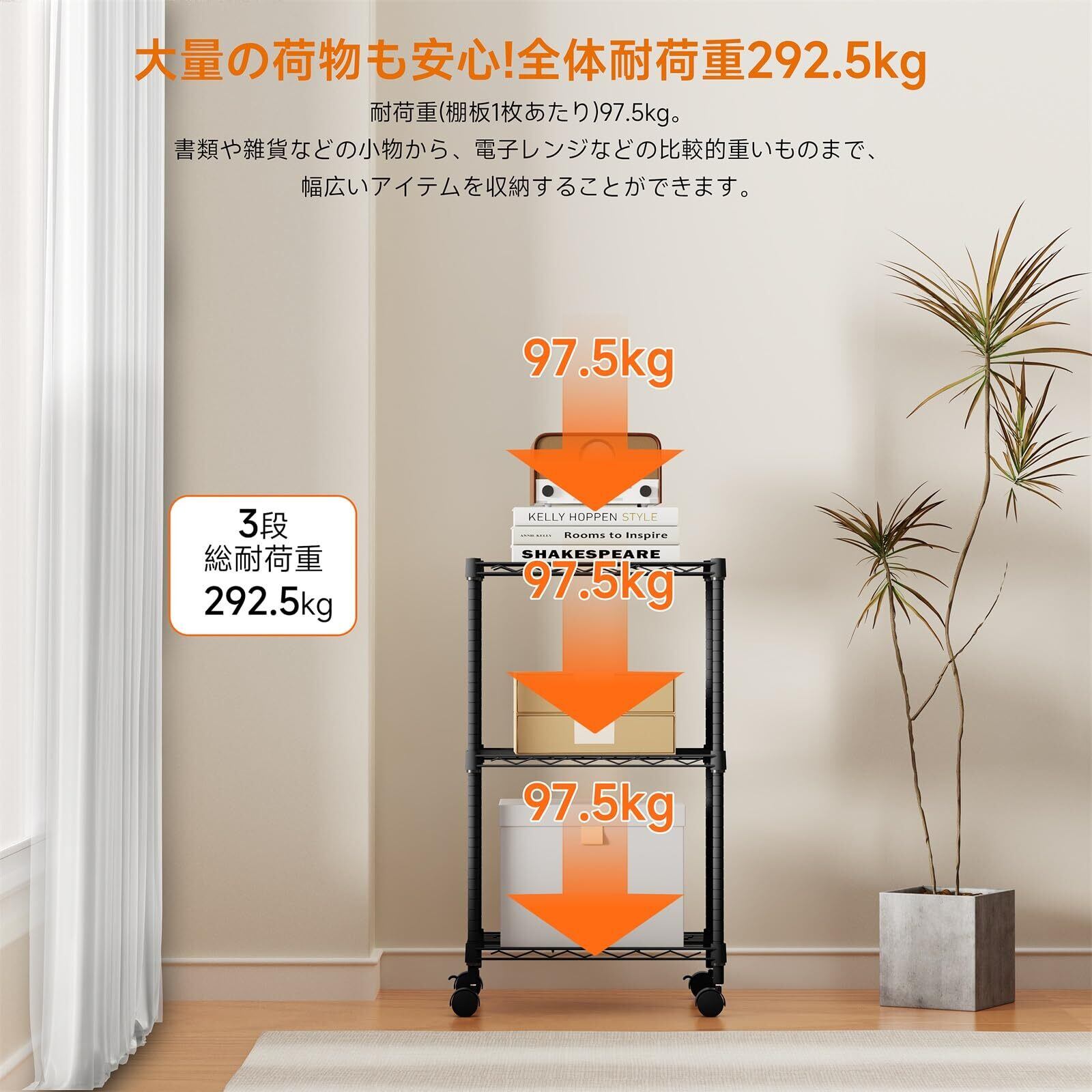 本体:重量4kg。材質:金属素材。棚1枚当たりの耐荷重は97.5kg。組み立てに道具不要。