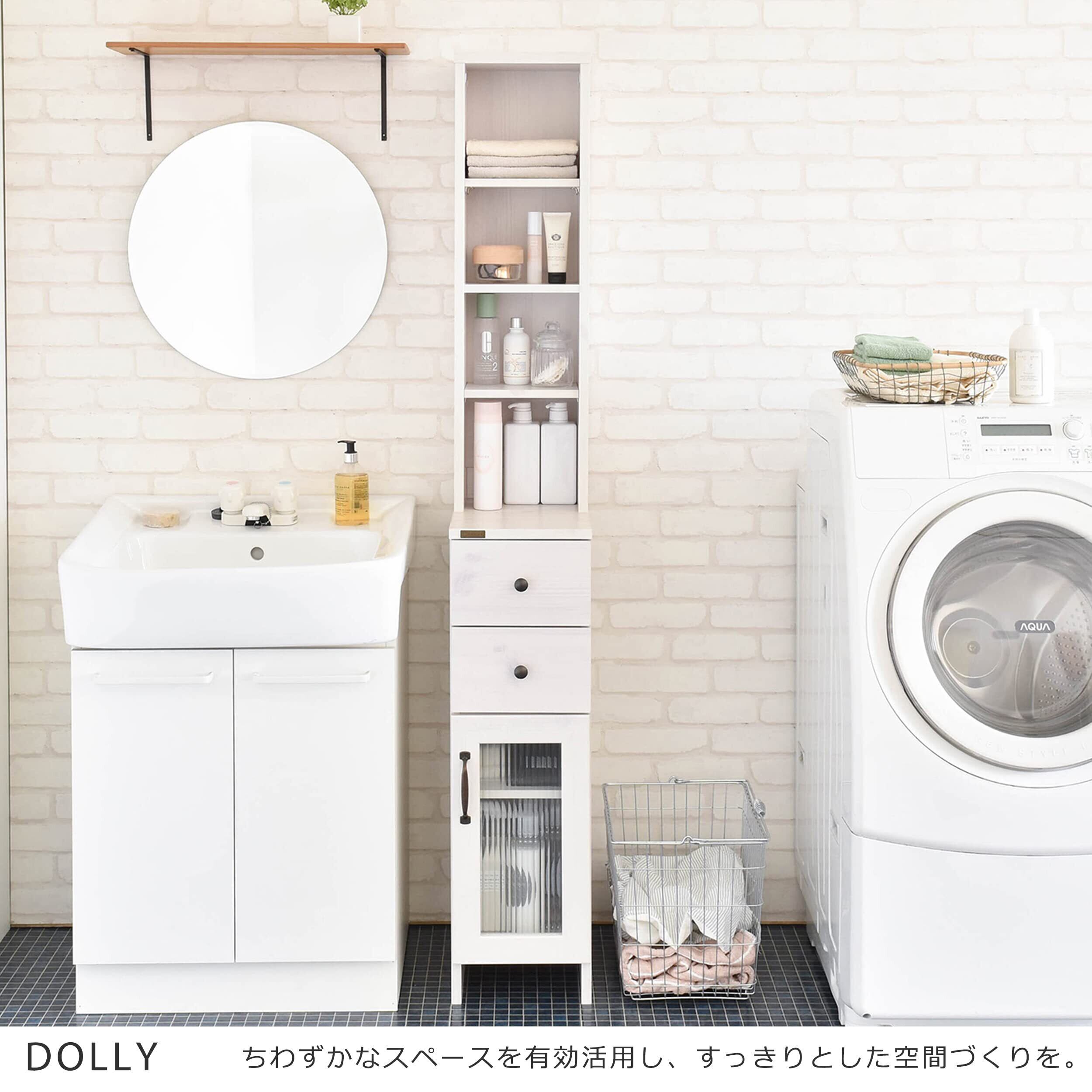 木目調のホワイトカラーが明るく清潔感あふれる空間を演出する「DOLLY(ドリー)」。3サイズ展開の隙間収納ラックで使用するスペースに合わせてお選びいただけます。ランドリーやキッチン周りのちょっとしたデッドスペースを有効活用するのにオススメです。