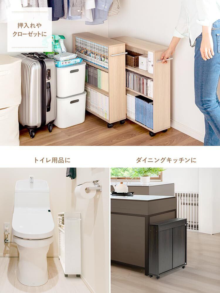 【すき間に収納スペースを!】押し入れやクローゼットにDVDやCD、ゲームソフトなどのメディアやコミックなどを収納することができるキャスター付き収納ラックです。横幅約15.5cmのスリム設計で、押し入れやクローゼットの他にデスク周りやキッチン周りなどの隙間にも収納することができます。