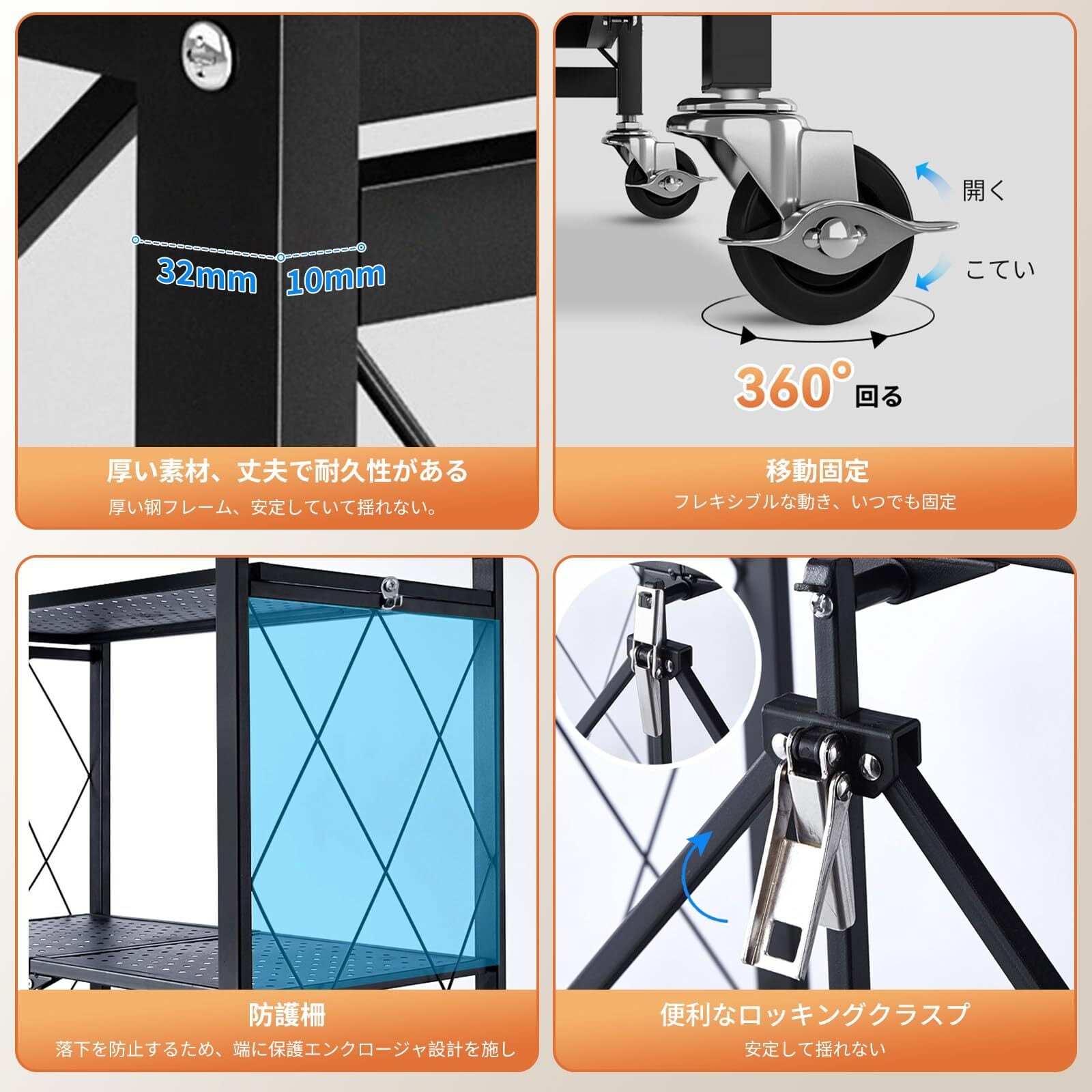 【組み立て簡単】 面倒な組み立て不要、開くだけで使用可能、女性でも簡単に組立てられます。キャスターを取り付けて、ラックの左右に広げてロックをかかれば組立完了です。