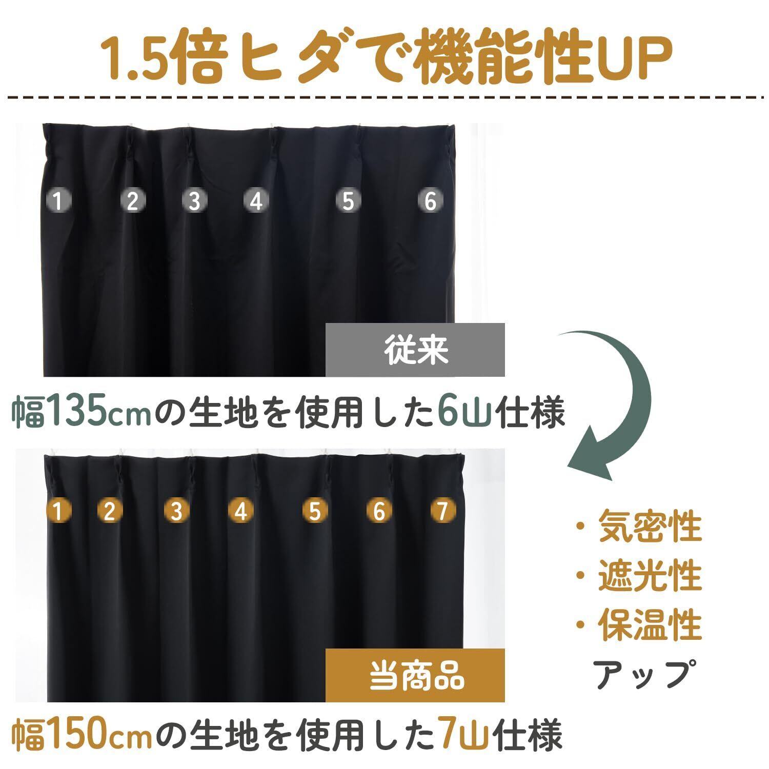 【商品仕様】※組成:ポリエステル100%生地を採用し、シルクのような柔らかさとマットな質感を実現。※機能:遮光1級 / 遮熱保温/ ウォッシャブル / 形状記憶加工。※縫製:1.5倍ヒダ/ 2ッ山を採用し、カーテンの出来上がり幅に対して使う生地の幅を1.5倍としっかり使うことで気密性が高くなり、遮光性や保温性がアップします。※形状記憶加工:カーテンを波型に整え、ピシッと整った状態を長く保ちます。