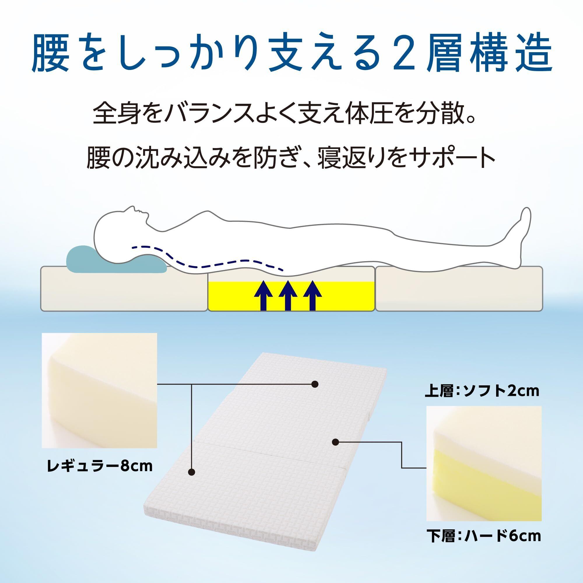 ◆「しっかり」と「ふんわり」のいいとこどりで、体をしっかりする2層構造。体のなかで最も重たい腰部分に硬めのウレタンフォームを使用しており、腰をしっかり支えます。さらにその硬めのウレタンフォームの上に2cmのソフト層をのせ、やさしい寝心地を実現。腰の沈み込みを防ぎつつ、寝返りをします。