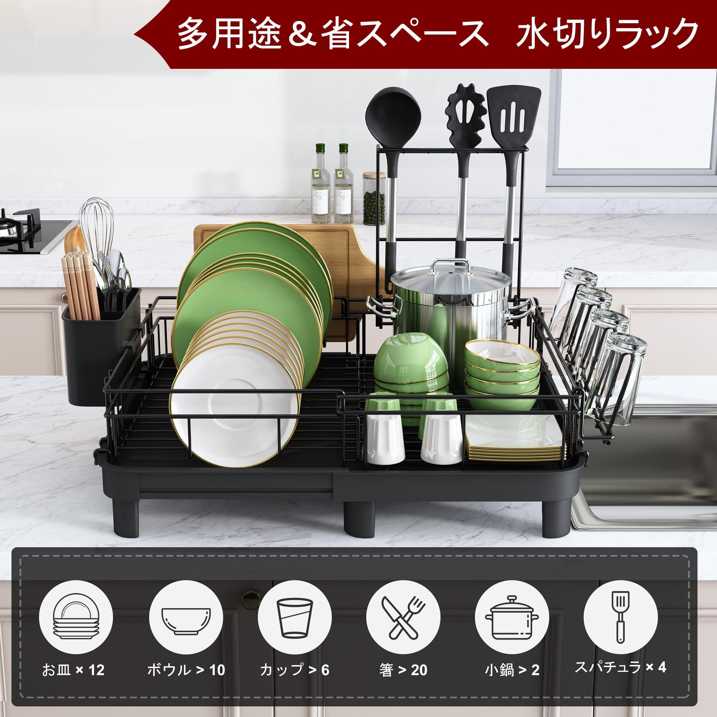 MAJALiS 水切りラック 伸縮式 食器 水切り 食器乾燥ラック 拡張機能 食器乾燥機 水切りかご 水切りカゴ 食器水切り 伸縮水切りラック キッチン 水切り 食器水切りラック 自動排水 スパチュラホルダー サイズ調節可能 大型 錆び防止 高耐荷重 水切り板付き ブラック | Lulu