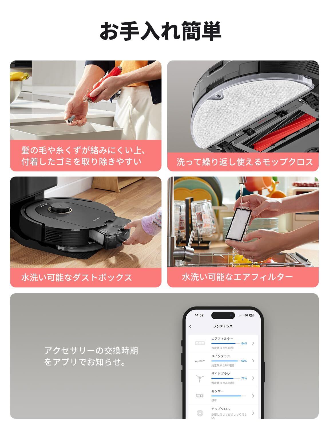 特徴 LiDARナビゲーション, エリア指定, スマートマッピング, バキュームとモップがけ同時処理, ペットの毛拾い