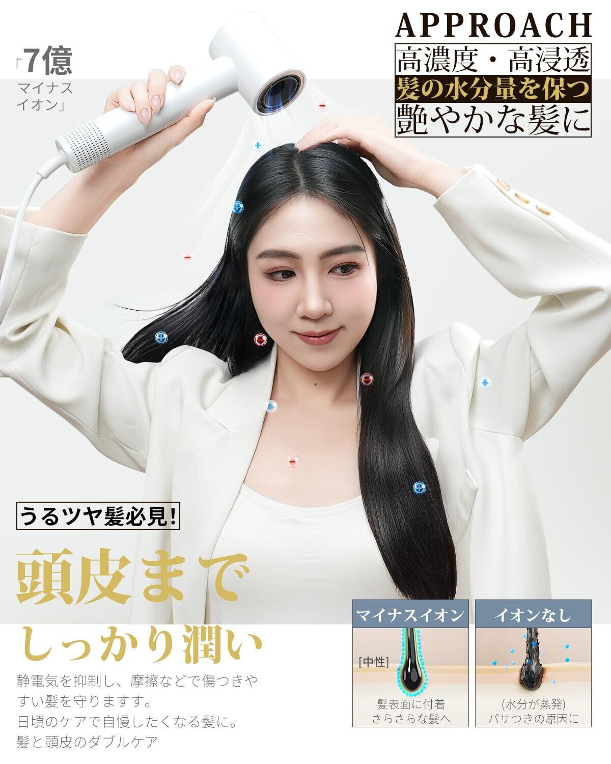 【何よりも安全を第一!高い技術力と安全性を兼ね備えた究極の低温 大風量 ドライヤー。細部までこだわった嬉しいポイント色々!】①磁石の魔法!360°回転マグネット式ノズルで効率的な吹き出し口が、髪を迅速に乾かし、あらゆる髪質や理想のスタイリングをします。②二重層吸収防止の吸込口フィルターは磁石で固定されています。お手入れも簡単。③NTC温度制御システムが100回/秒の温度検出を行い、設定範囲を超えると自動的に電力を下げるほか、④サーモスタットと⑤温度ヒューズも備えており、過熱保護を確保しいます。⑥PSE取得済み。安全性を第一の目指して、日本専用の特別に設計されています