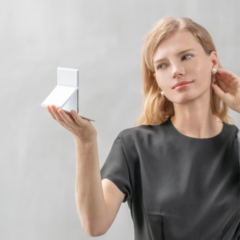 【軽量・コンパクト】従来の折りたたみミラー(当社比)よりも薄く軽いので、場所をとらずコンパクトに収納でき、バッグやポーチに入れても邪魔になりません。旅行やお出かけ時など持ち運びに便利です。カードケースサイズで小さくコンパクトなので、外出先でメイクのチェックをするのに最適です。サイズ8cm×10.8cm、厚み0.7cm、重量約70g