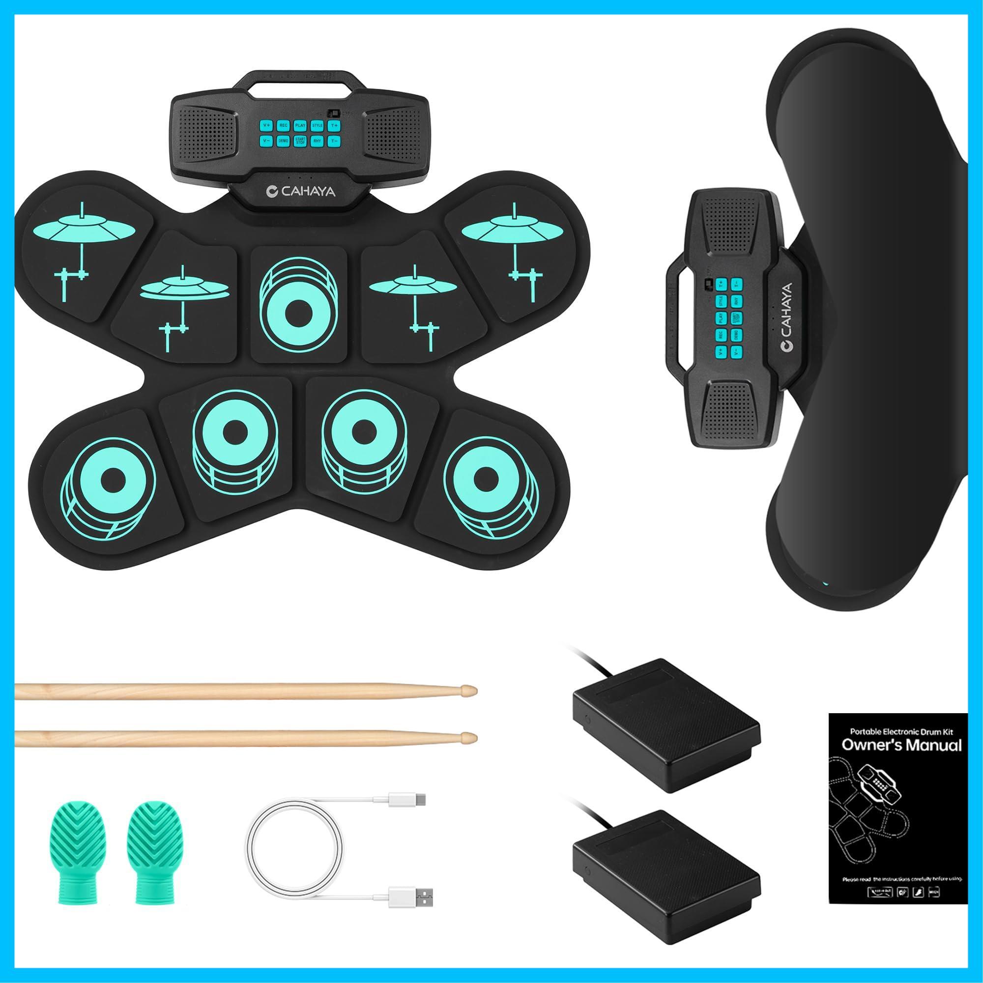 CAHAYA 電子ドラムパッド セット ドラムスティックキャップ付き 9パッド 初心者向け バッテリー寿命10時間 ロールアップ電子ドラムセット折りたたみ式 ドラムスティック付き 2ペダル付き 緑 | Lulu