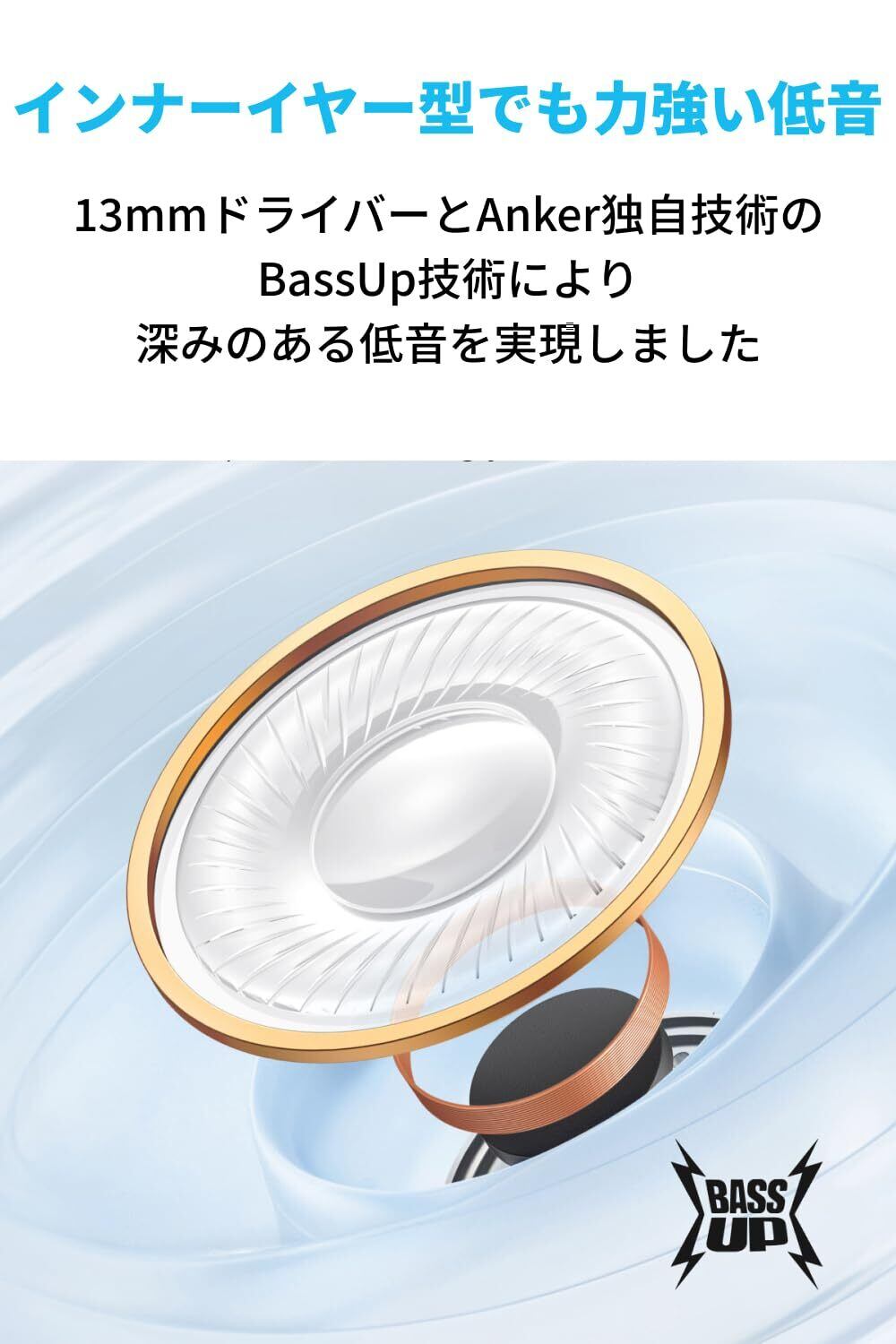 インナーイヤー型でも力強い低音: 13mmドライバーとAnker独自技術のBassUp技術により、深みのある低音を実現しました。