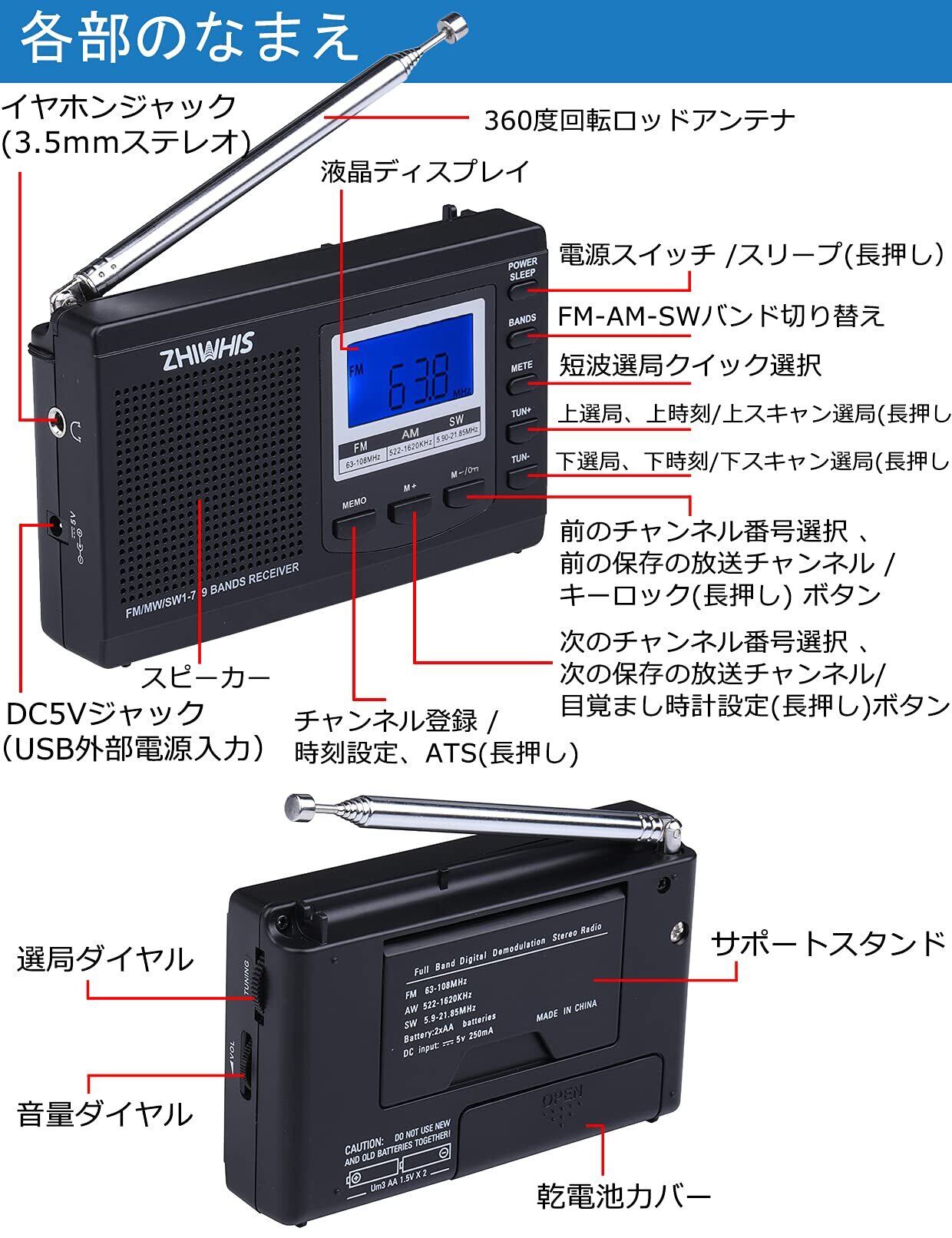 ZHIWHIS ラジオ 小型ポータブル FM/AM/SW ワイドfm対応 クロック防災ラジオ 電池式 タイマー/目覚まし時計/デジタル時計/キーロック/プリセット機能付き 横置き型 携帯 学習 災害用 日本語取説&書付き