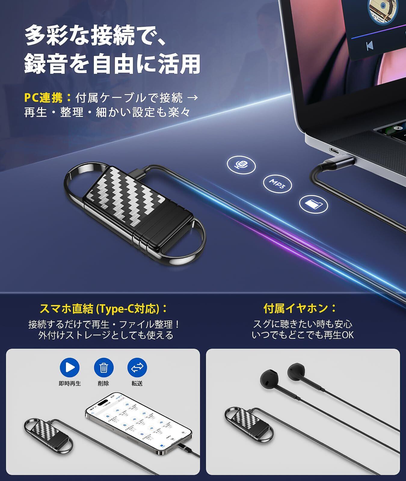 【便利な録音再生とデバイス接続】本レコーダーは、PC・スマートフォン・ヘッドホンなど、さまざまな方法で録音を再生できます。付属のデータケーブルを使用すれば、スマホやPCに簡単に接続でき、録音の再生・削除・バックアップが可能です。また、付属のイヤホンを使えば、手軽に録音を再生できるので、いつでもどこでも確認ができます