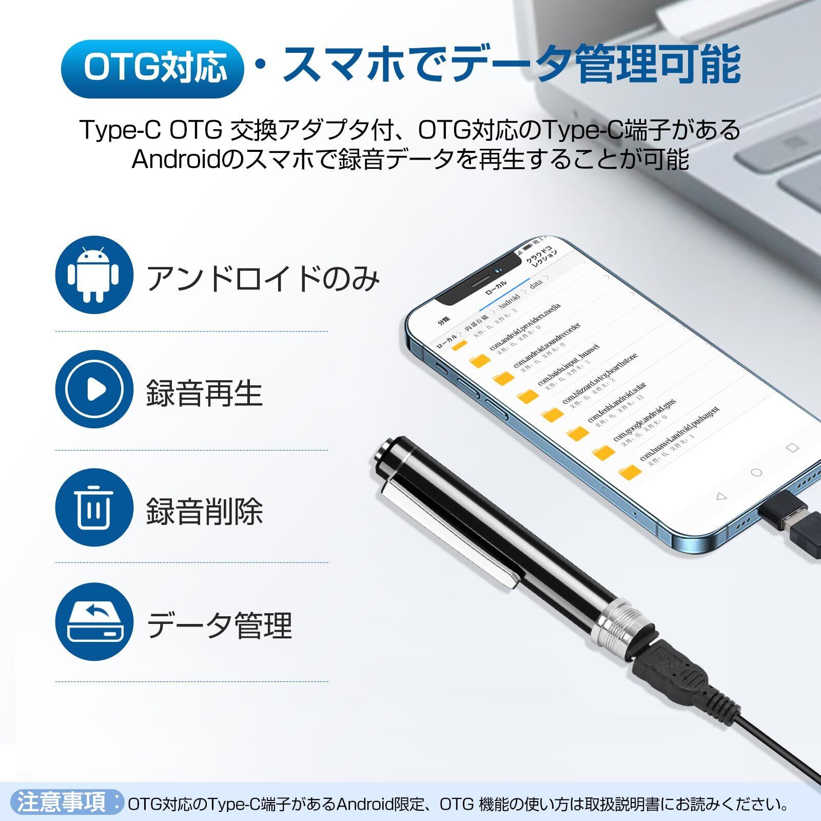 【OTG対応 データ管理楽々】録音した後、Type-C OTG変換アダプタ(付属)を使用して、OTG対応Type-C端子があるAndroidのスマホ・タブレットで録音データを再生・保存することができます;付属されたイヤホンにより、直接的にボイスレコーダー 小型本体でで録音確認することができ;USBケーブルを使用してパソコンに接続して、データ管理、音声の再生や削除、録音設定などを操作できます。
