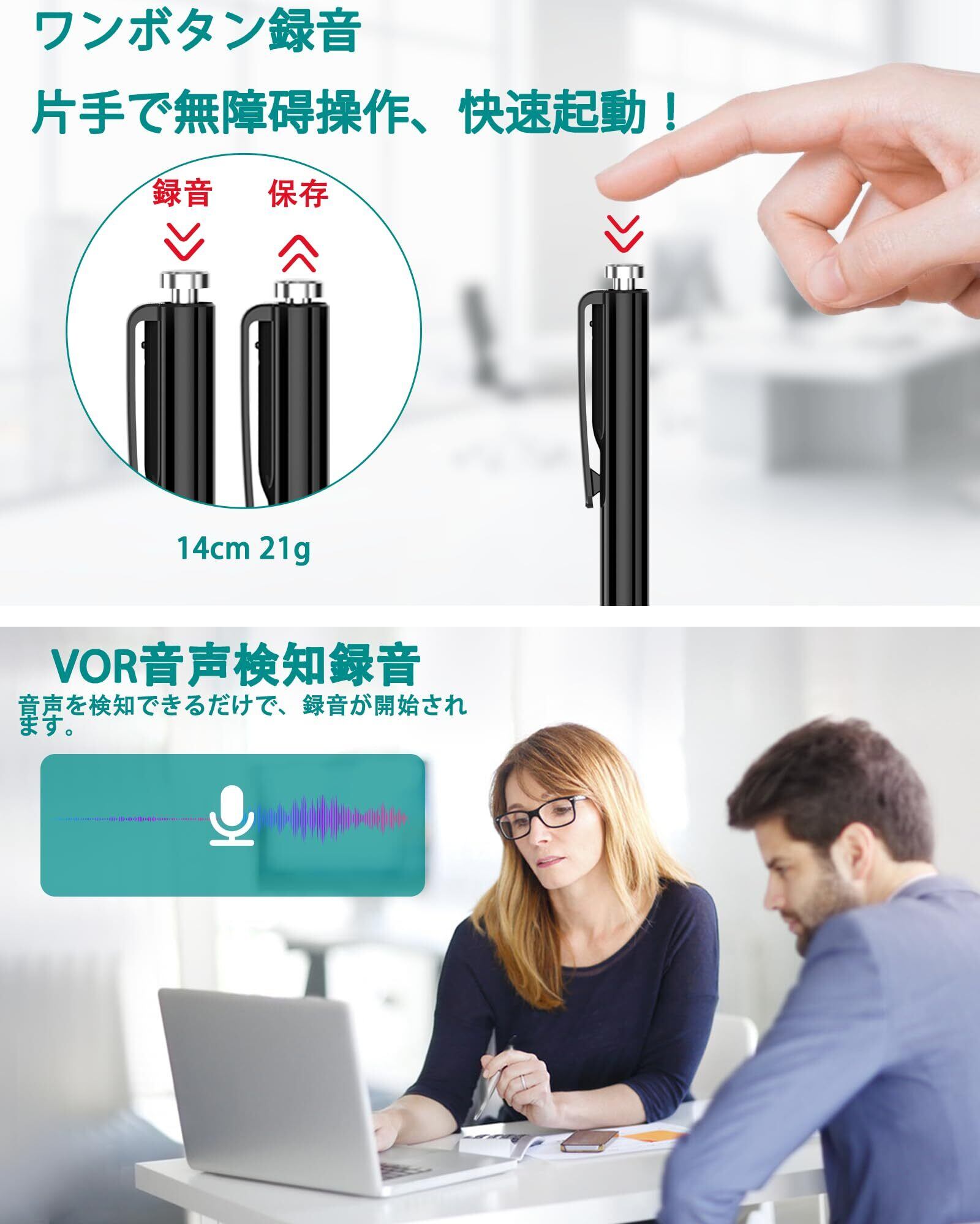 ✍【ワンタッチ録音・保存—ペン型ボイスレコーダー】操作簡単。録音ボタンを押すと、青と赤ライト3回点滅消灯、録音開始。電源ボタンもう一度を押しと、赤ライトが2回点滅、録音保存。見た目はボールペンなので、会議や商談のときに、メモを取りながら、自然で使えます。セクハラやパワハラ対策として役に立てます。
