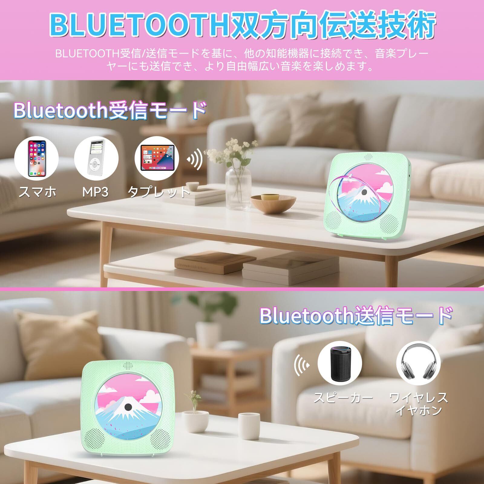 【多機能の卓上&壁掛け式CDプレーヤー】Y01 CDプレーヤーは、Bluetoothデュアルモード(受信/送信モード)を搭載しており、スマホ、MP3などの音楽を再生できだけでなく、ワイヤレスイヤホン、スピーカーなども接続でき、深夜の音楽鑑賞でも家族に迷惑をかけず、より自由に幅広い音楽を楽しめます。CD再生のほかに、FMラジオ機能(周波数:76~108MHz)にも対応しており、緊急時のラジオとしても実用的です。 また、本体またはリモコンの「MODE」でBluetoothモード/CDモード/FMモード/USBモードの4つのモードを簡単に選択できます。ご注意:本製品のBluetooth送信モードはCDモードとUSBモードで使用しかできません。