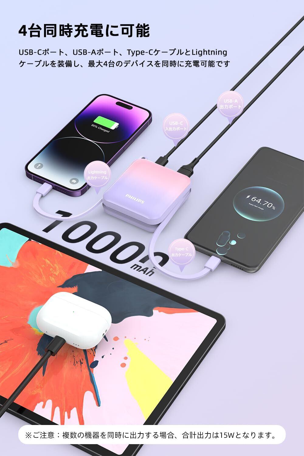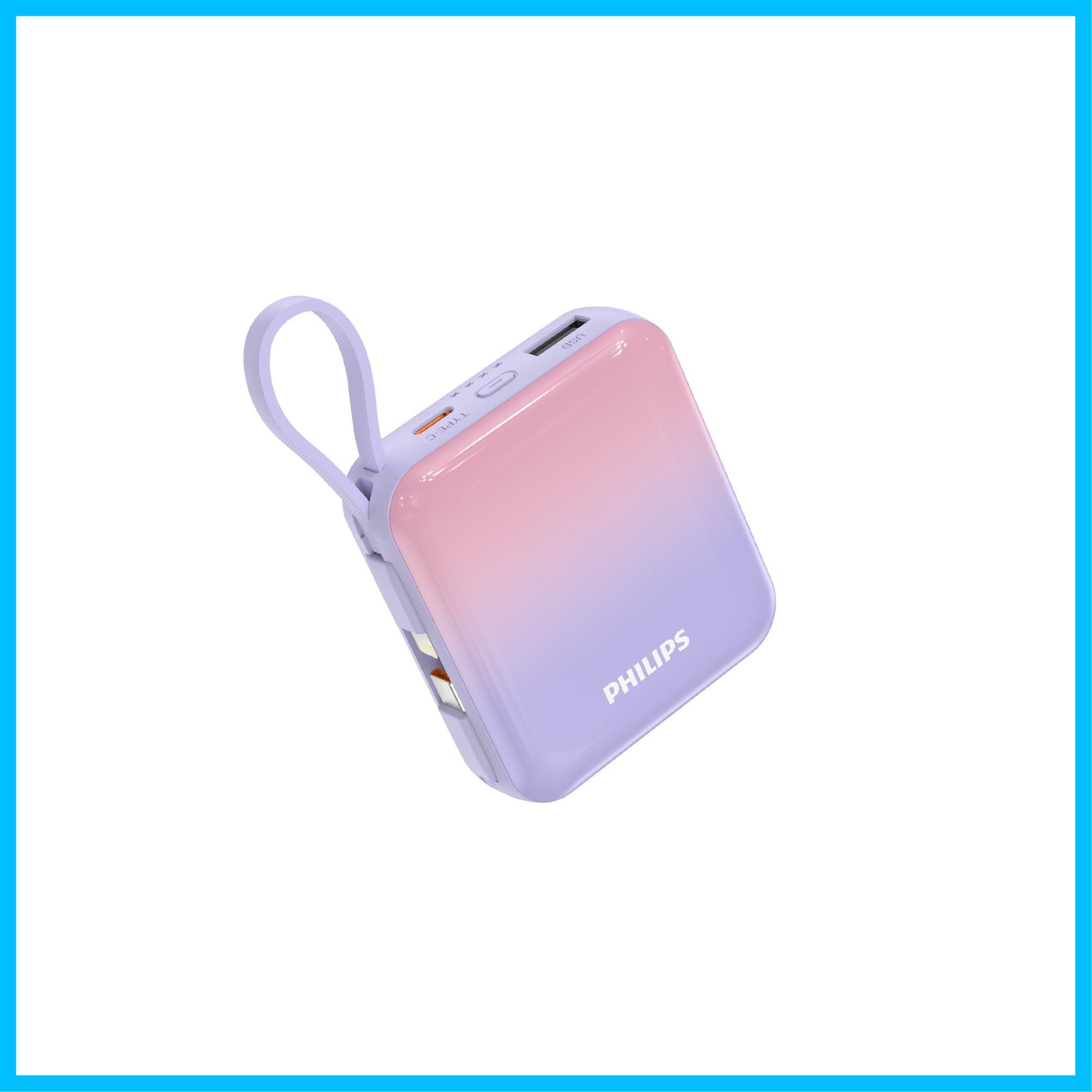 Philips (フィリップス) モバイルバッテリー 10000mAh 大容量 小型 携帯充電器 Lightning type-c ケーブル内蔵 22.5W タイプc ライトニング 4台同時充電 スマホ 持ち運び iPhone 16 / 15 Android iPad 各種機器対応 PSE認証済 (ピンク紫)