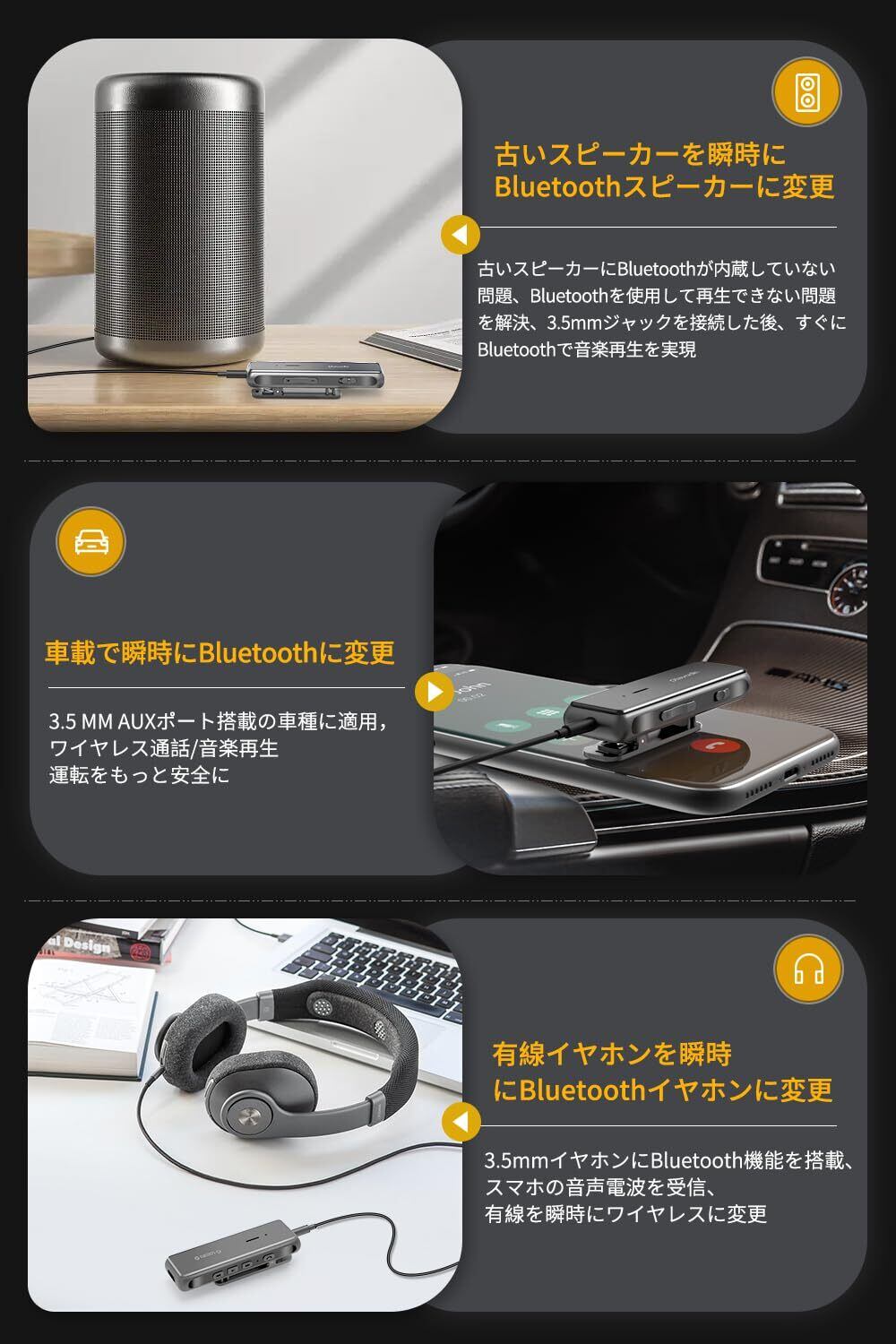 【Bluetooth非対応機器を簡単にワイヤレス化 】Bluetooth機能のないカーオーディオ、スピーカーやコンポ等とスマホやタブレットをワイヤレス接続可能、汎用3.5mmプラグ付き、車用、家庭用、様々なシーンでスピーカー、イヤホン、AUX入力を備えた車、家庭用ステレオなどに対応します。