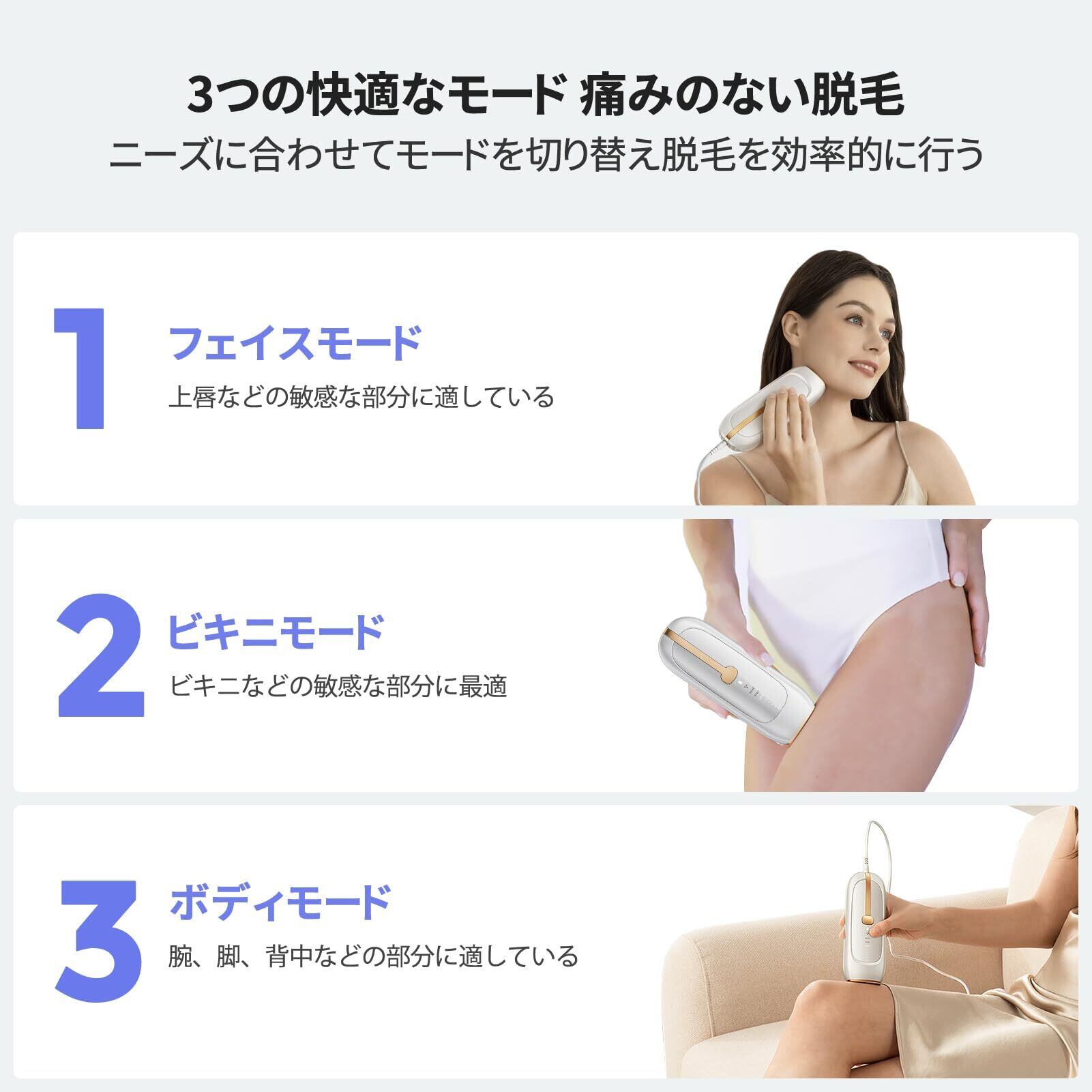 【選べる3モード搭載・自宅でも手軽にプロなエステサロン級体験を】:脱毛器本体は、シンプルな縦長デザインのコンパクト設計で、285gと軽量なため、細かな操作にも対応できる優れた操作性を発揮し、長時間の使用でも疲れにくいといった、扱う人に優しい設計となっています。初心者でも使いやすい光美容器として、「ボディモード」「フェイスモード」「ビキニモード」三つの段階に設定されて、各エリアの脱毛ニーズに合わせて切り替えて、ケアを効率的に行っていただけます。これさえあれば、サロンに通わなくても、パーソナルなムダ毛ケアが自宅でできる光美容器です。