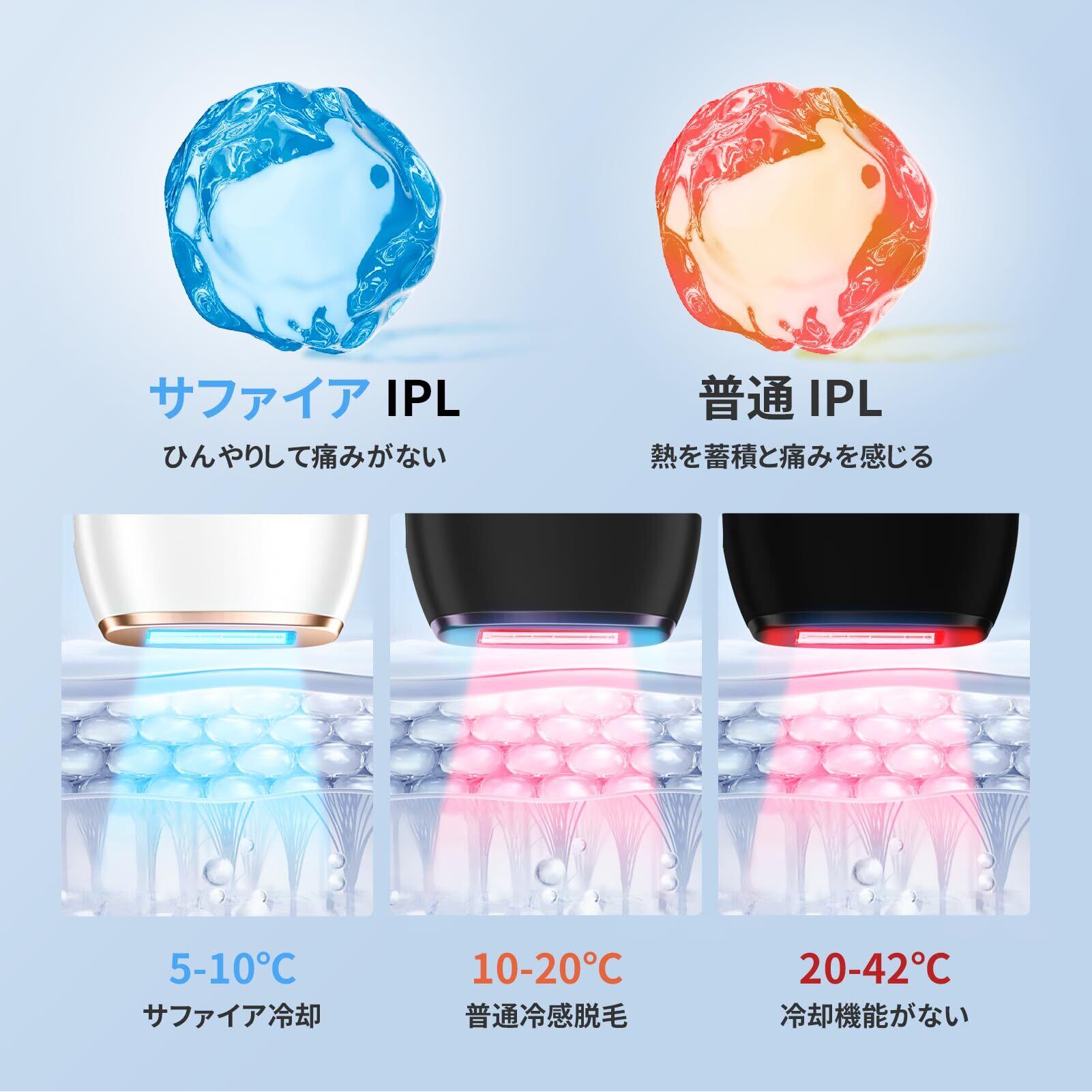 【平らなサファイアヘッド設計のメリット】:2025年最新サロン級光脱毛器は、プロが使用しているフラット構造のサファイアクリスタルヘッドを採用します。脱毛時に、凹凸のない平らなサファイアヘッドをお肌に押し当て密着させて、毛が成長する部分である毛包の根元を、表皮の高エネルギーエリアに近づけることができるため、毛包のエネルギー吸収効率を高めることができます。加えて、サファイアクリスタルは光の透過性(透明度が高い)に優れており、発光点から発せられた光エネルギーがダイレクトにガラス面と接したお肌部分に届くので、これらの効果から、従来型の凹型構造の照射口と比べ、脱毛効果を30%アップさせることができています。