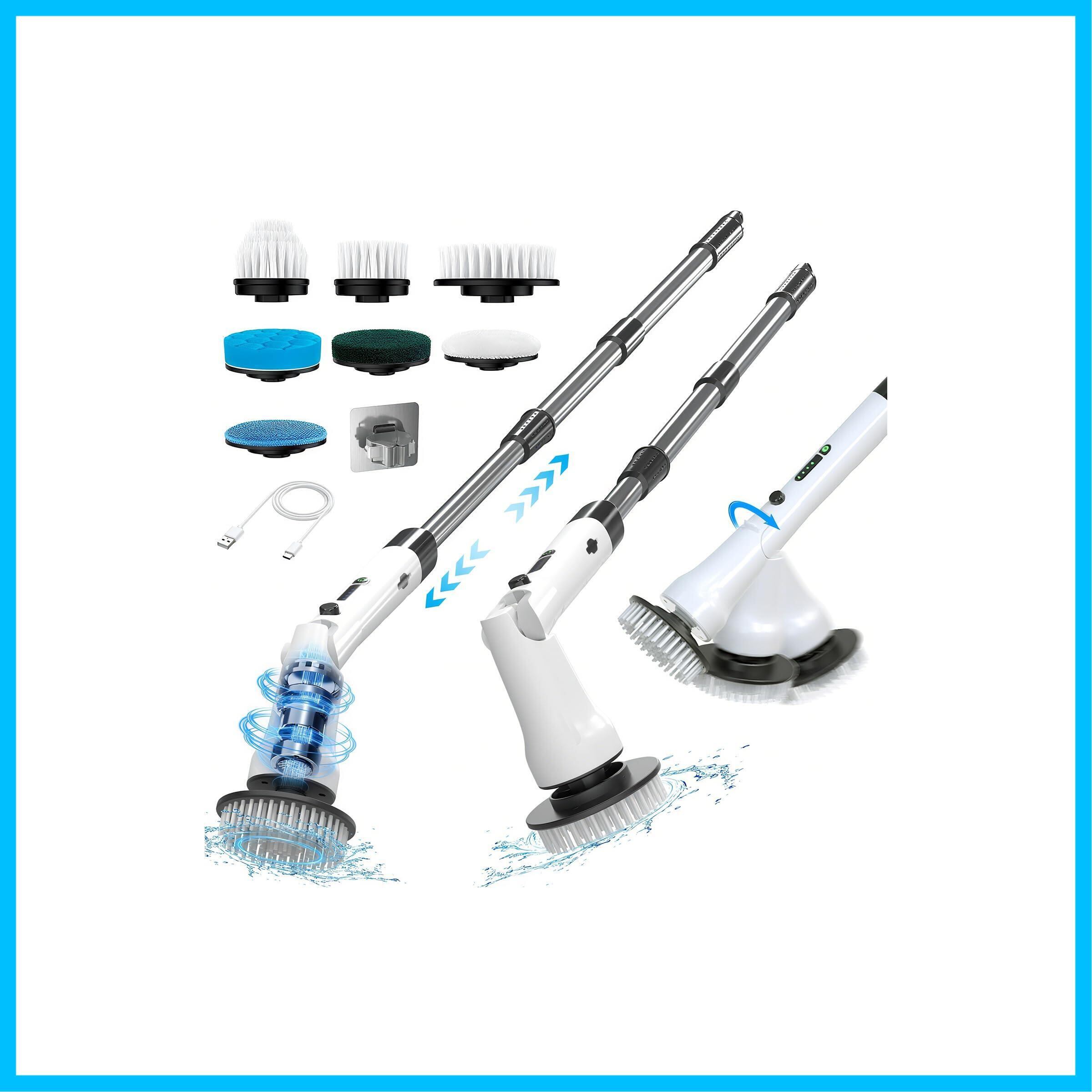 電動お掃除ブラシ バスポリッシャー 7つ取り替えブラシ付き、3つの角度と長さの調整 USB C充電式 2段階速度 清掃風呂 浴室 浴槽磨き トイレ掃除 床 窓 壁 玄関 壁掛けフック付き