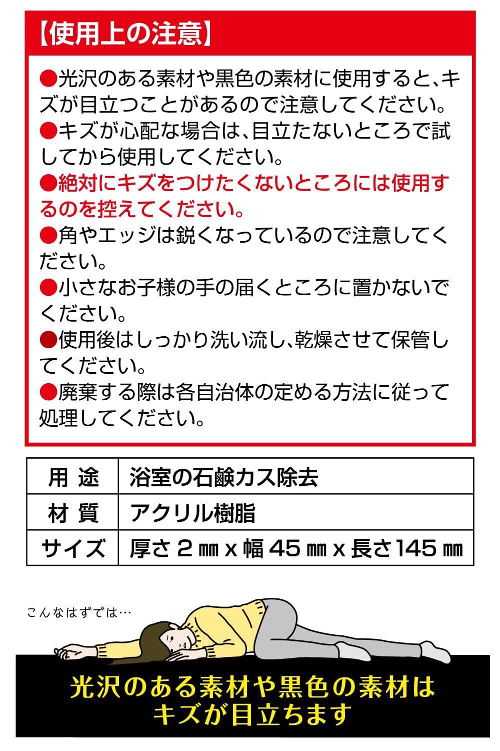 ■用途:浴室の石鹸カス除去 ■使用前の準備:両面についた保護シートを外してから使用します。 ■使用方法:固まった石鹸カスに根岸棒を優しく当てて、こそぎ落とすように使用してください。 ■使用上の注意:光沢のある素材や黒色の素材に使用すると、キズが目立つことがあるので注意してください。キズが心配な場合は、目立たないところで試してから使用してください。絶対にキズをつけたくないところには使用するのを控えてください。 角やエッジは鋭くなっているので注意してください。小さなお子様の手の届くところに置かないでください。使用後はしっかり洗い流し、乾燥させて保管してください。廃棄する際は各自治体の定める方法に従って処理してください。